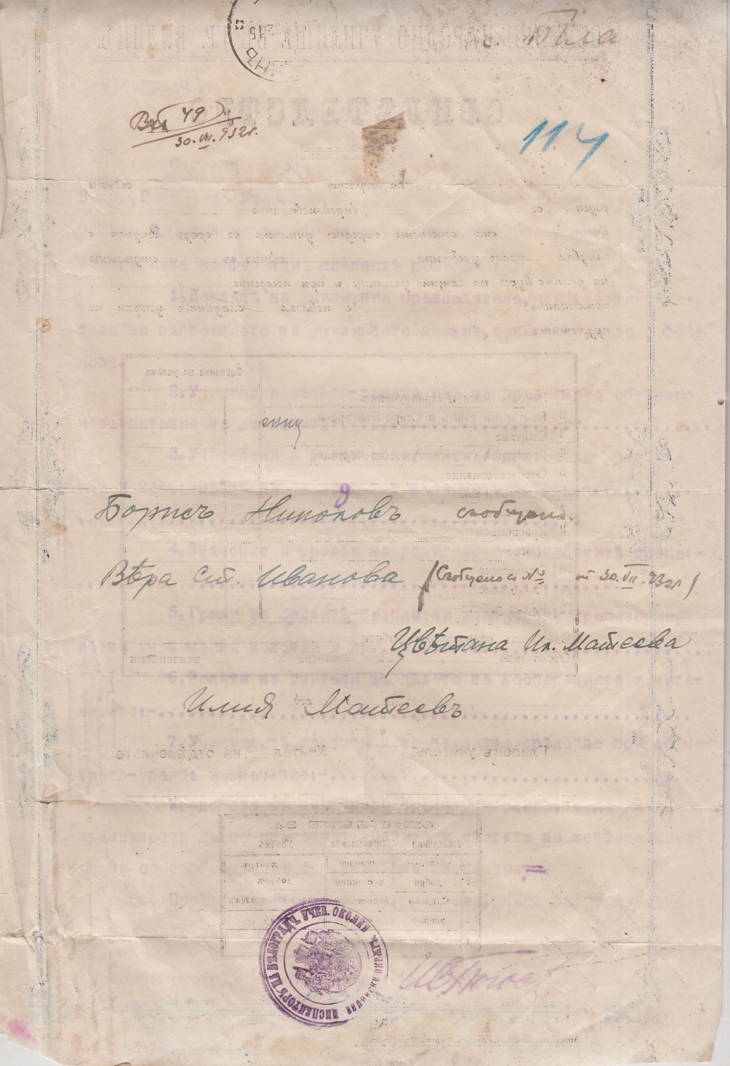 1932 год. Вера Ст.Иванова – съобщено, Борис Николов – съобщено, Илия Матеев.