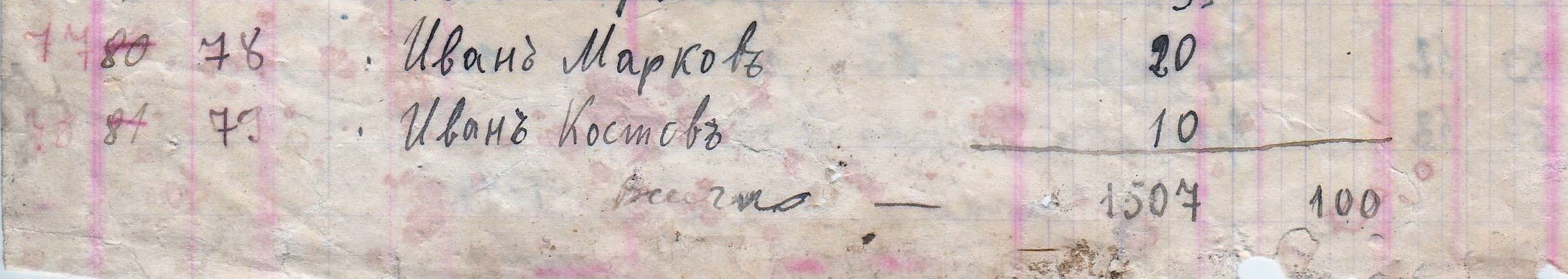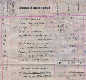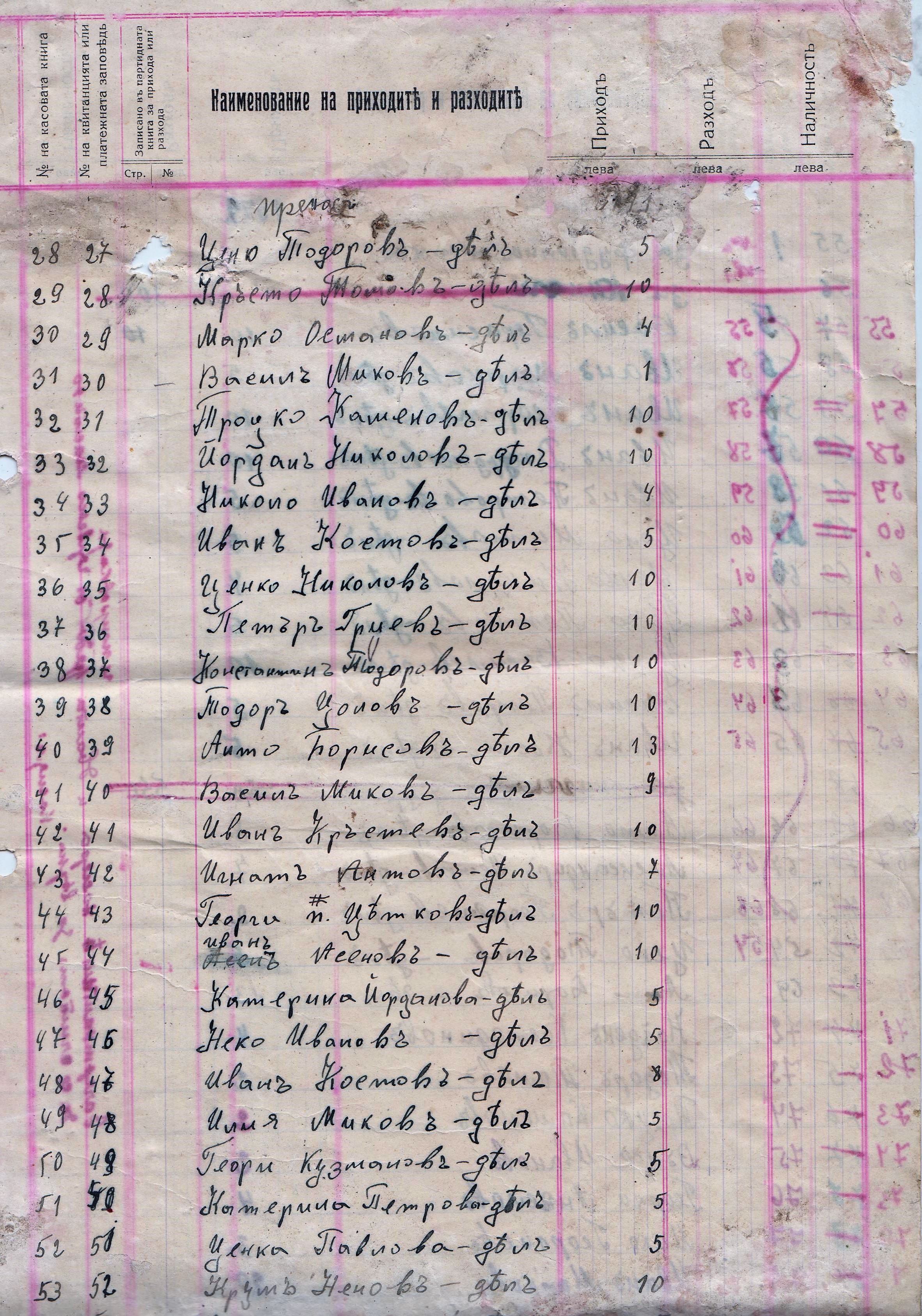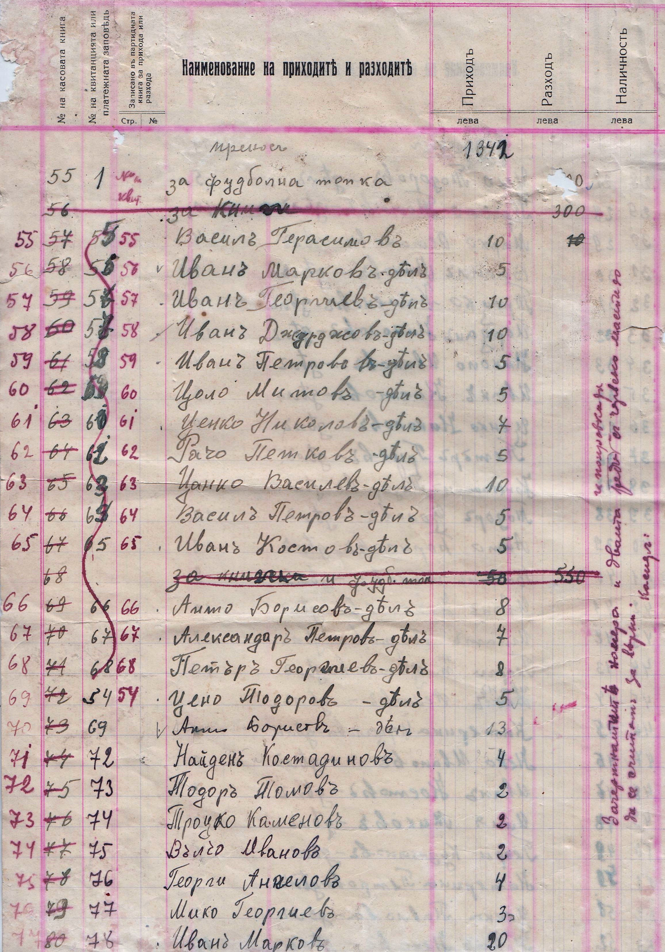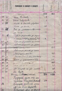 Предадена сума от магазинера Йордан Николов, от магазинера Пешо Лозанов, Повърнат дел от Васил Стефанов – напуснал кооперацията, Също на Стоян Инков, От продадени учебници, Непредадени от Васил Герасимов – Магазинер.