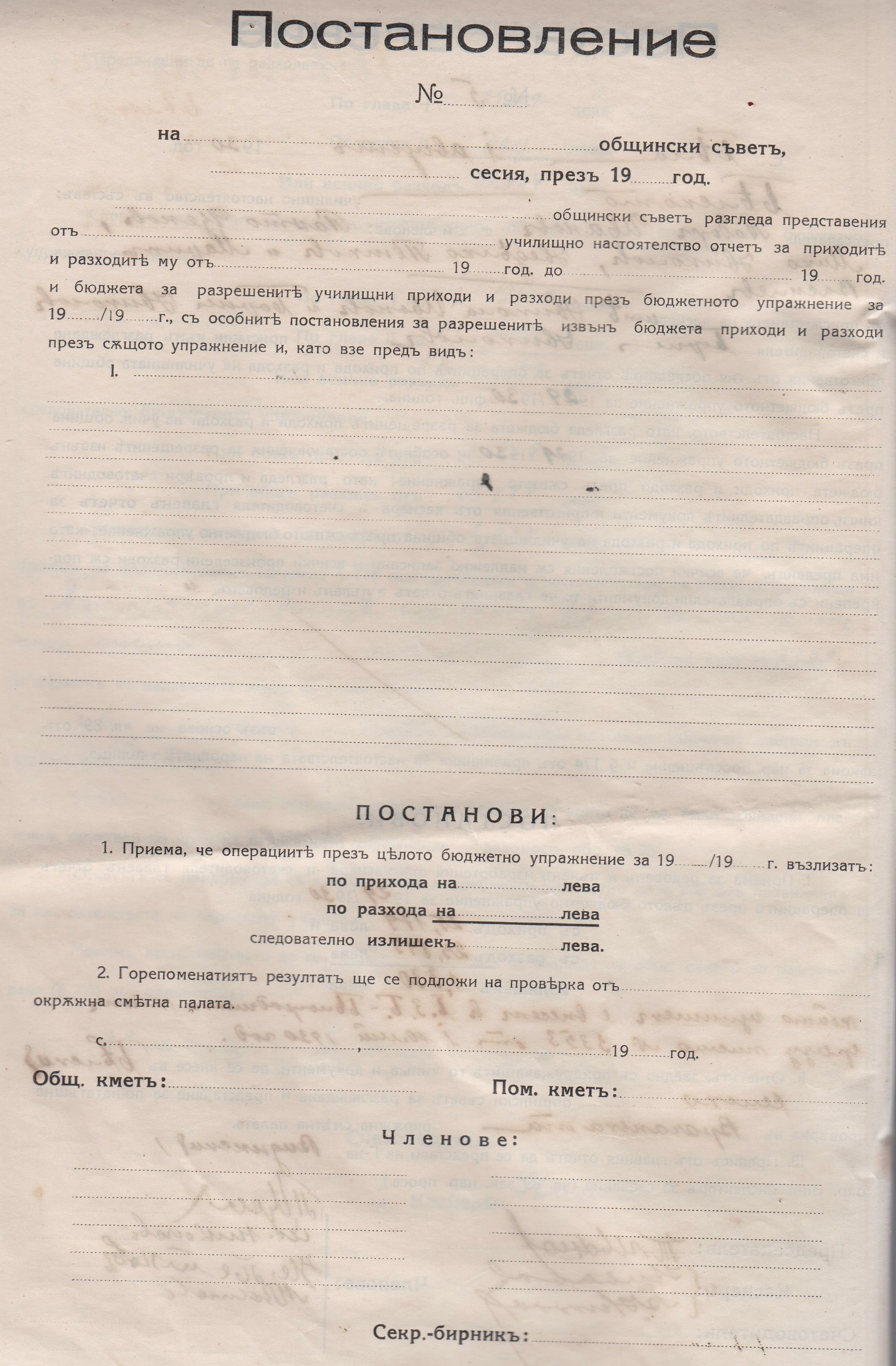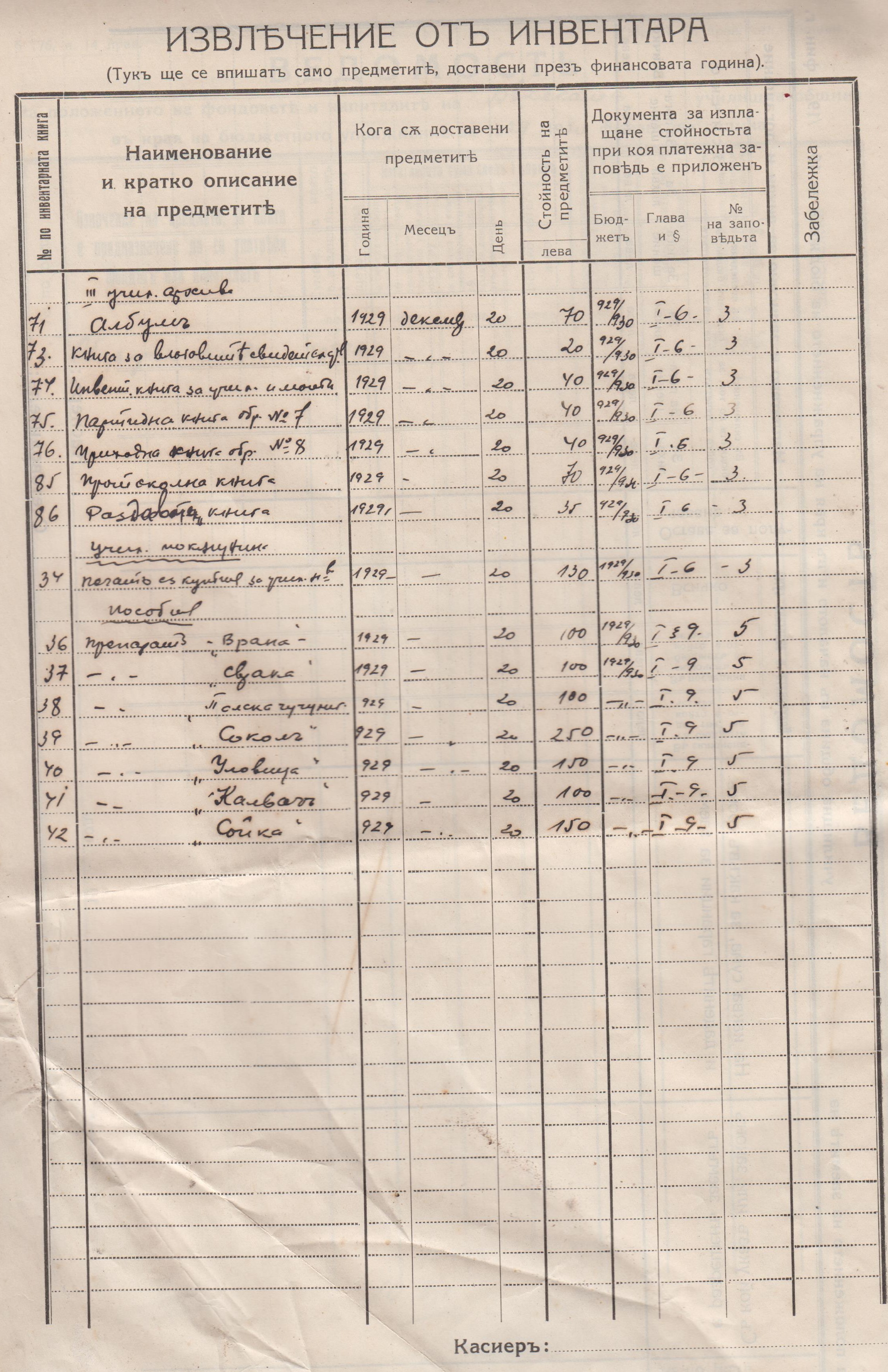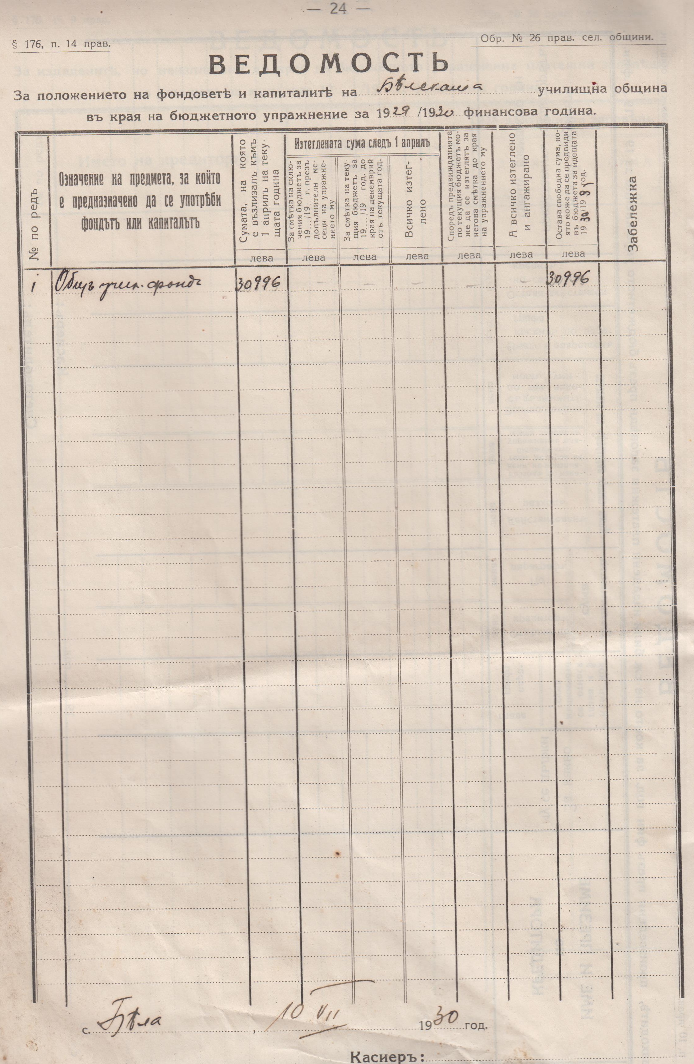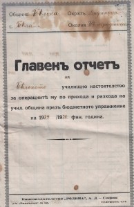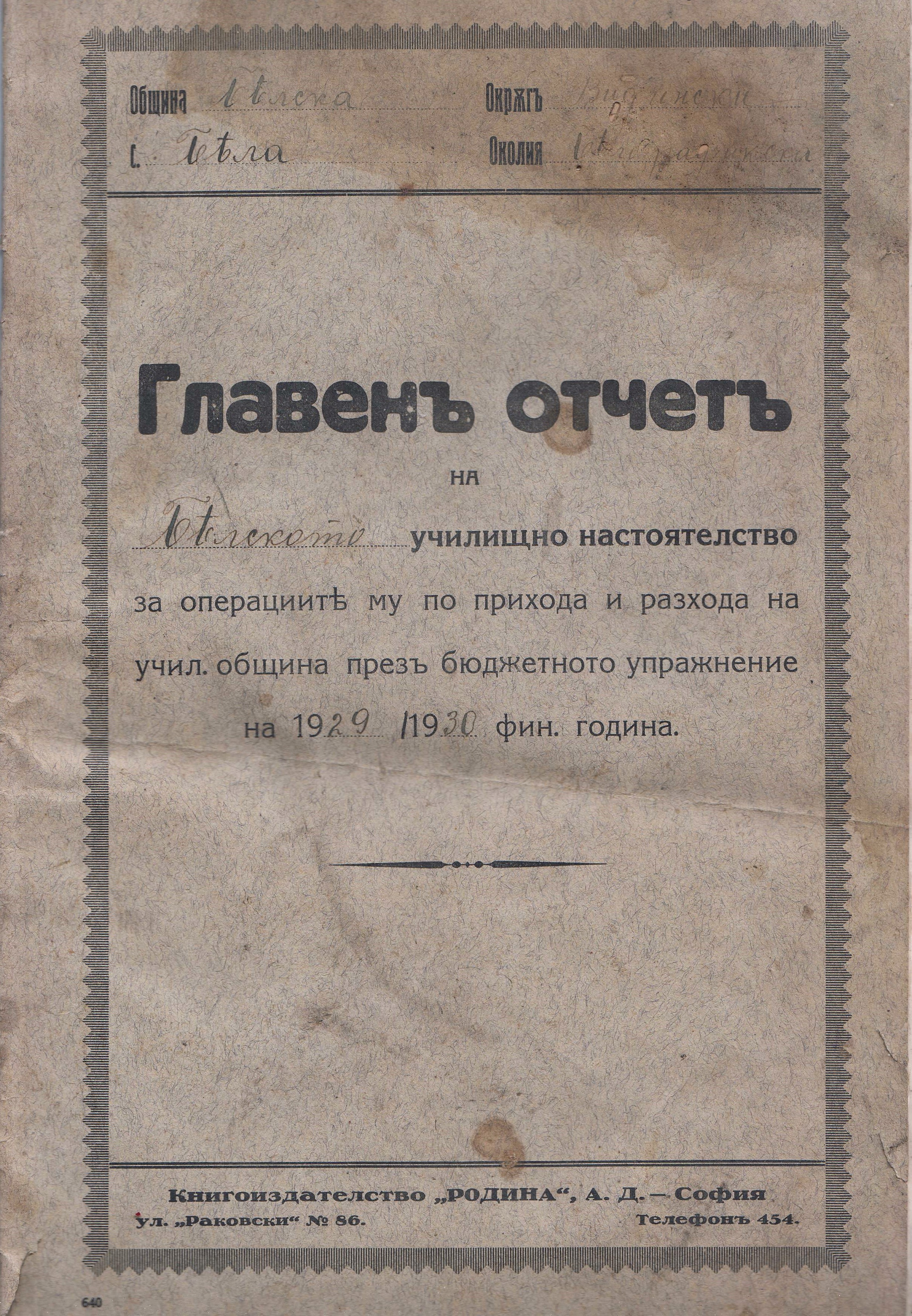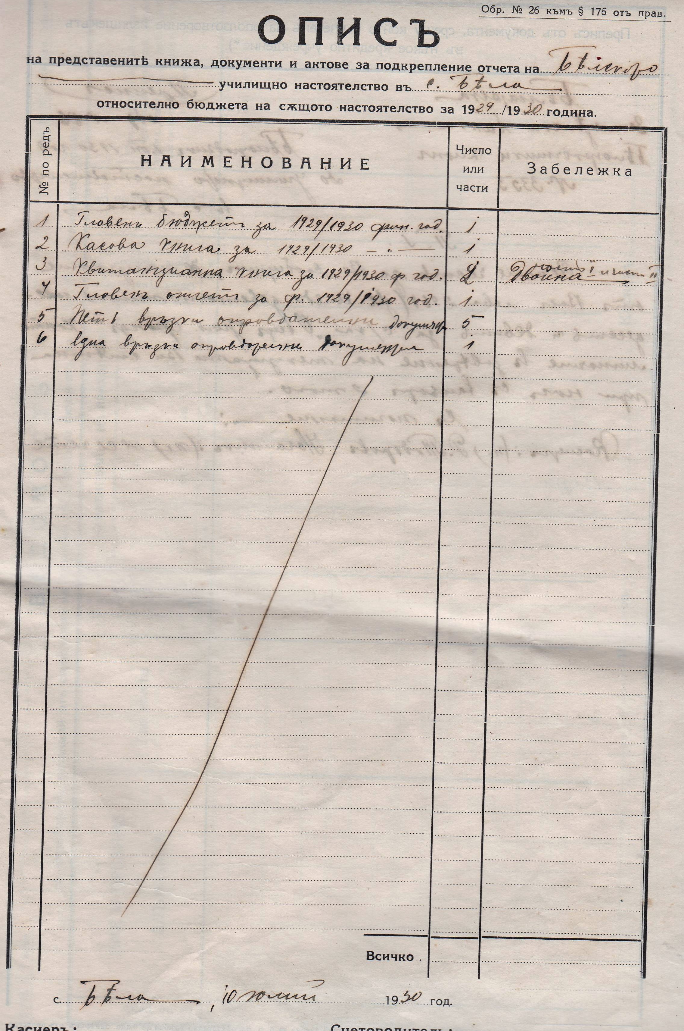- Главен бюджет за 1929/30 фин. год., 2. Касова книга за 1929/30 г., 3. Квитанционна книга за 1929/30г., 4. Главен отчет за ф. 1929/30 г., 5. Пет връзки оправдателни документи, 6. Една връзка оправдателни документи.