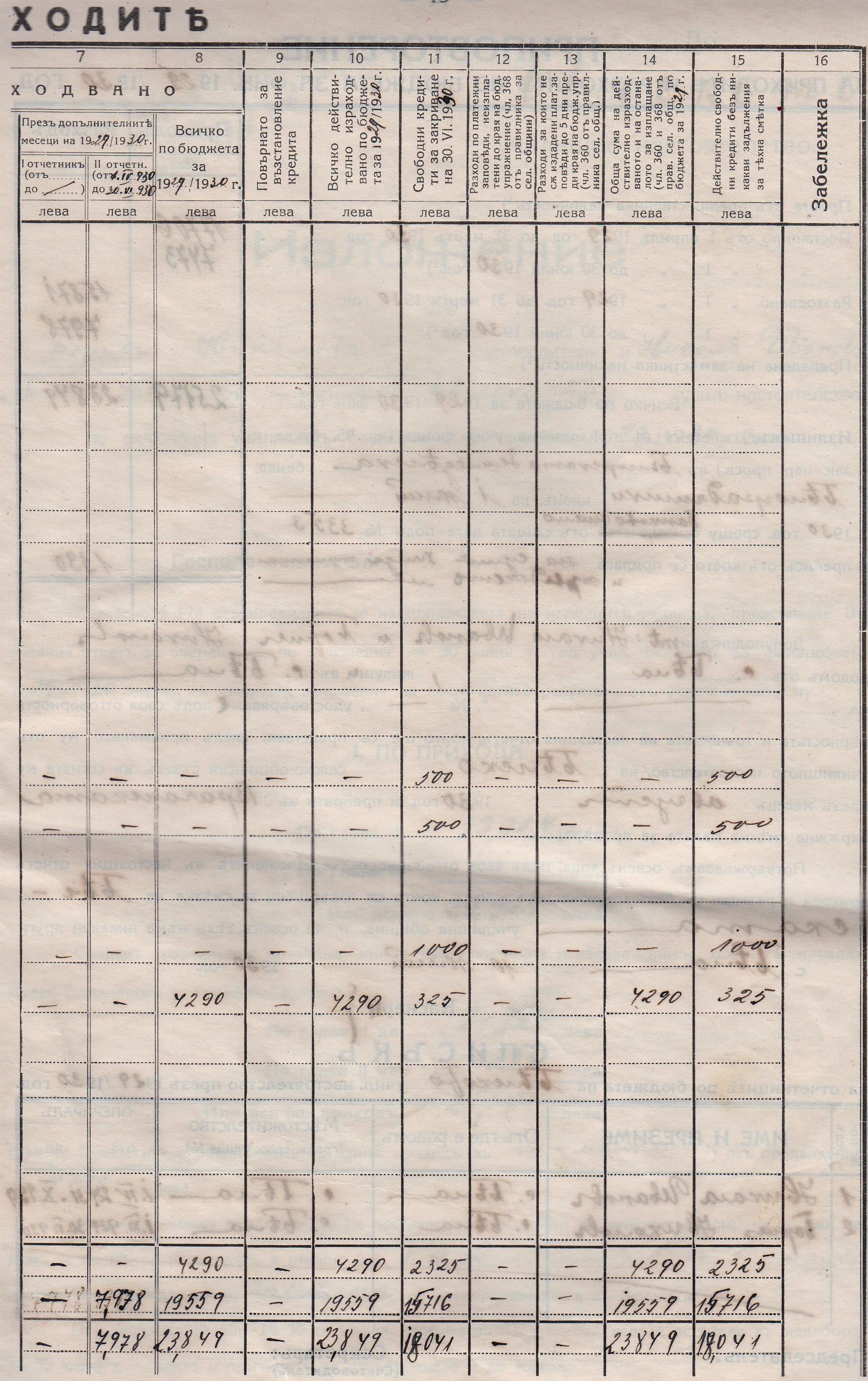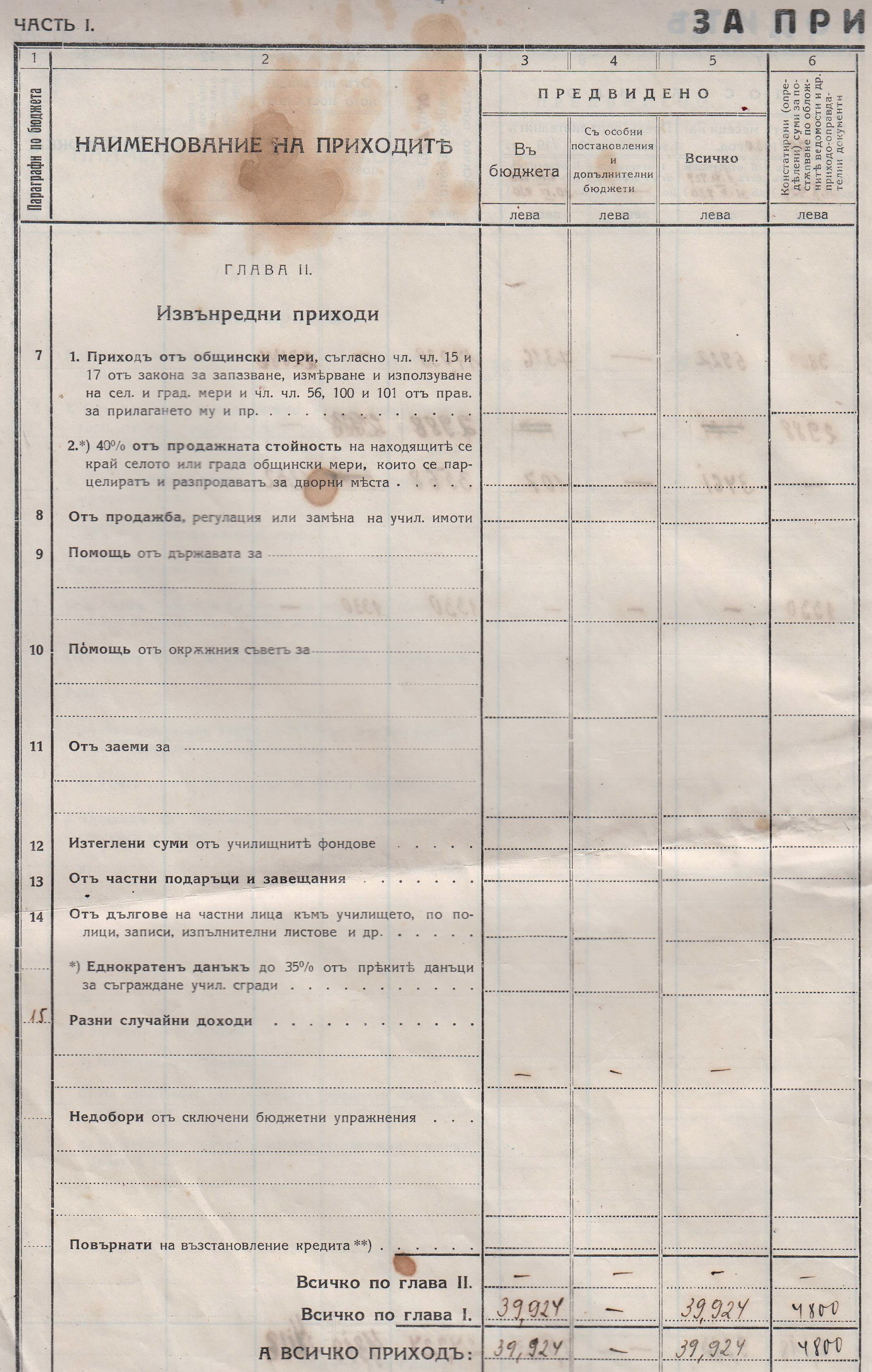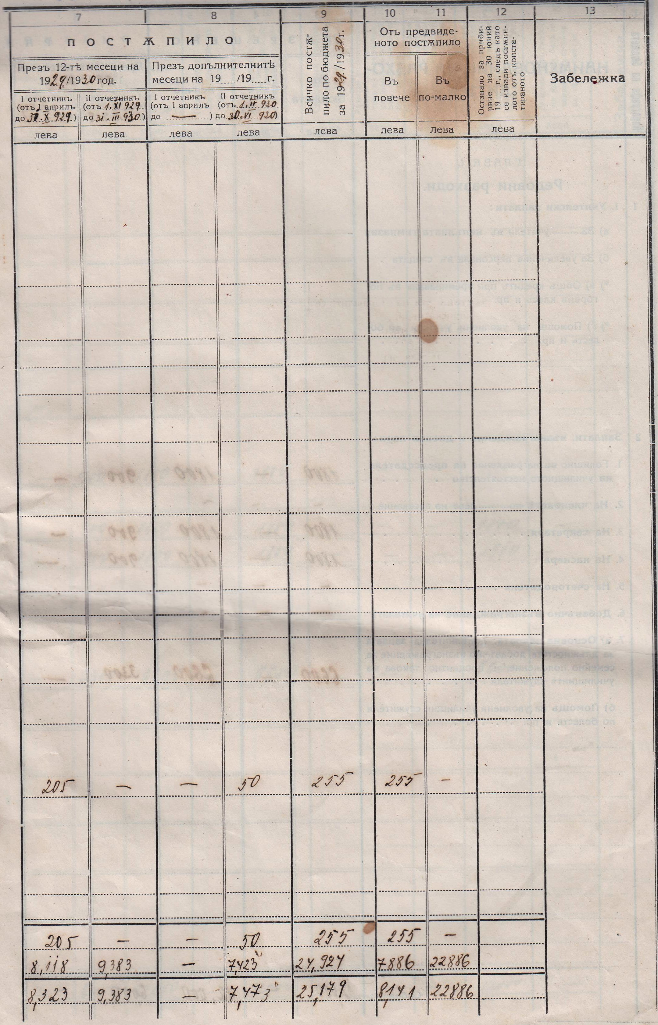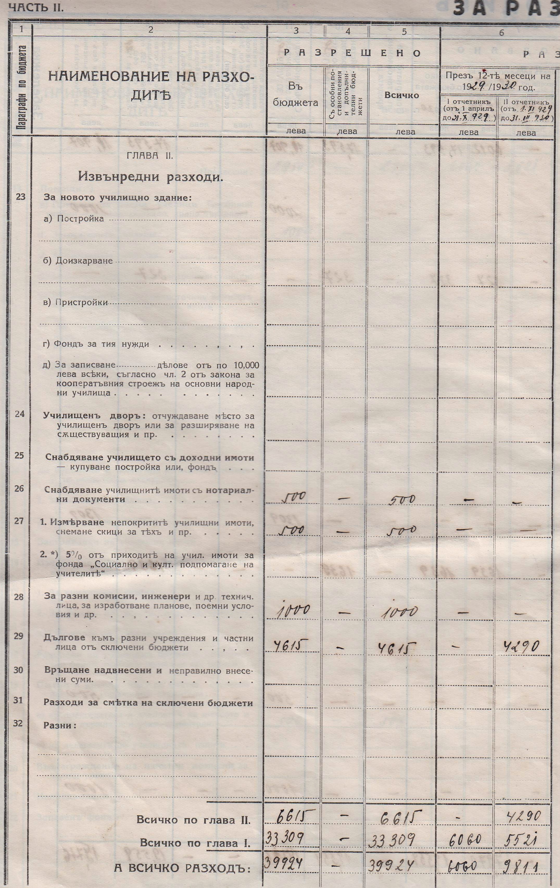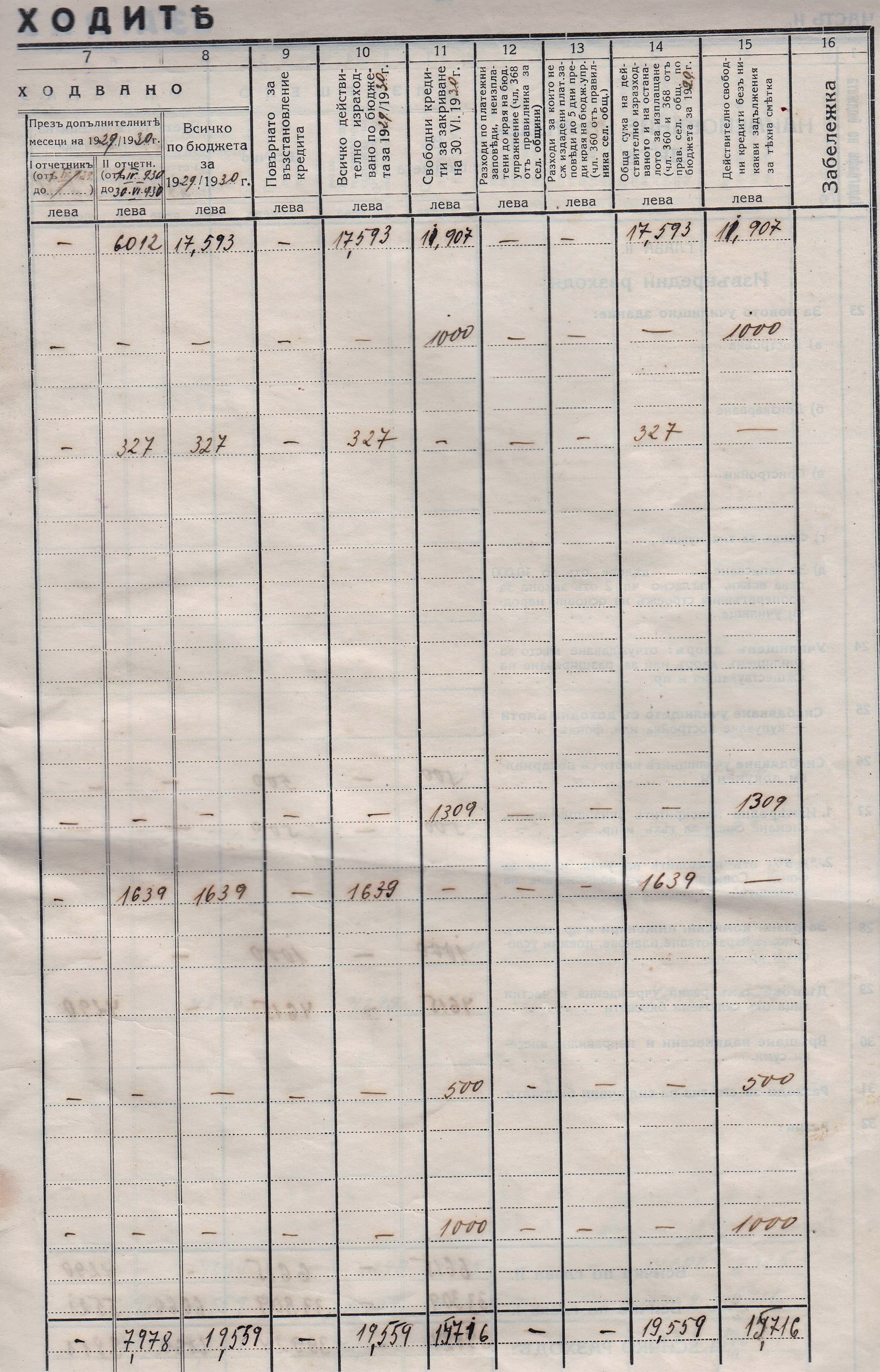 - Главен бюджет за 1929/30 фин. год., 2. Касова книга за 1929/30 г., 3. Квитанционна книга за 1929/30г., 4. Главен отчет за ф. 1929/30 г., 5. Пет връзки оправдателни документи, 6. Една връзка оправдателни документи.