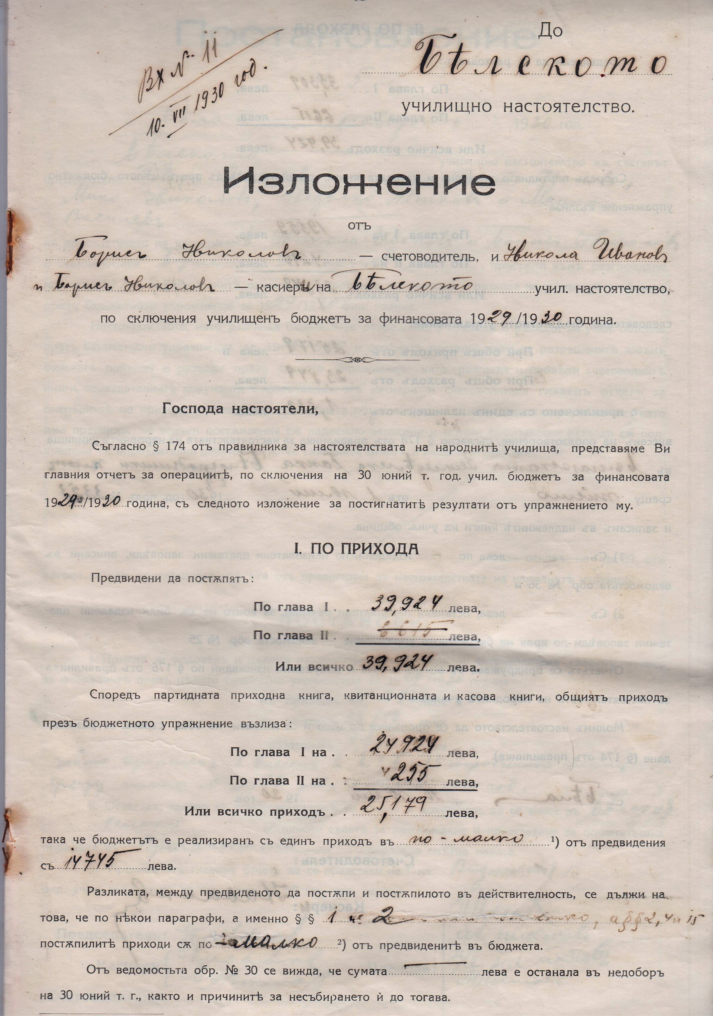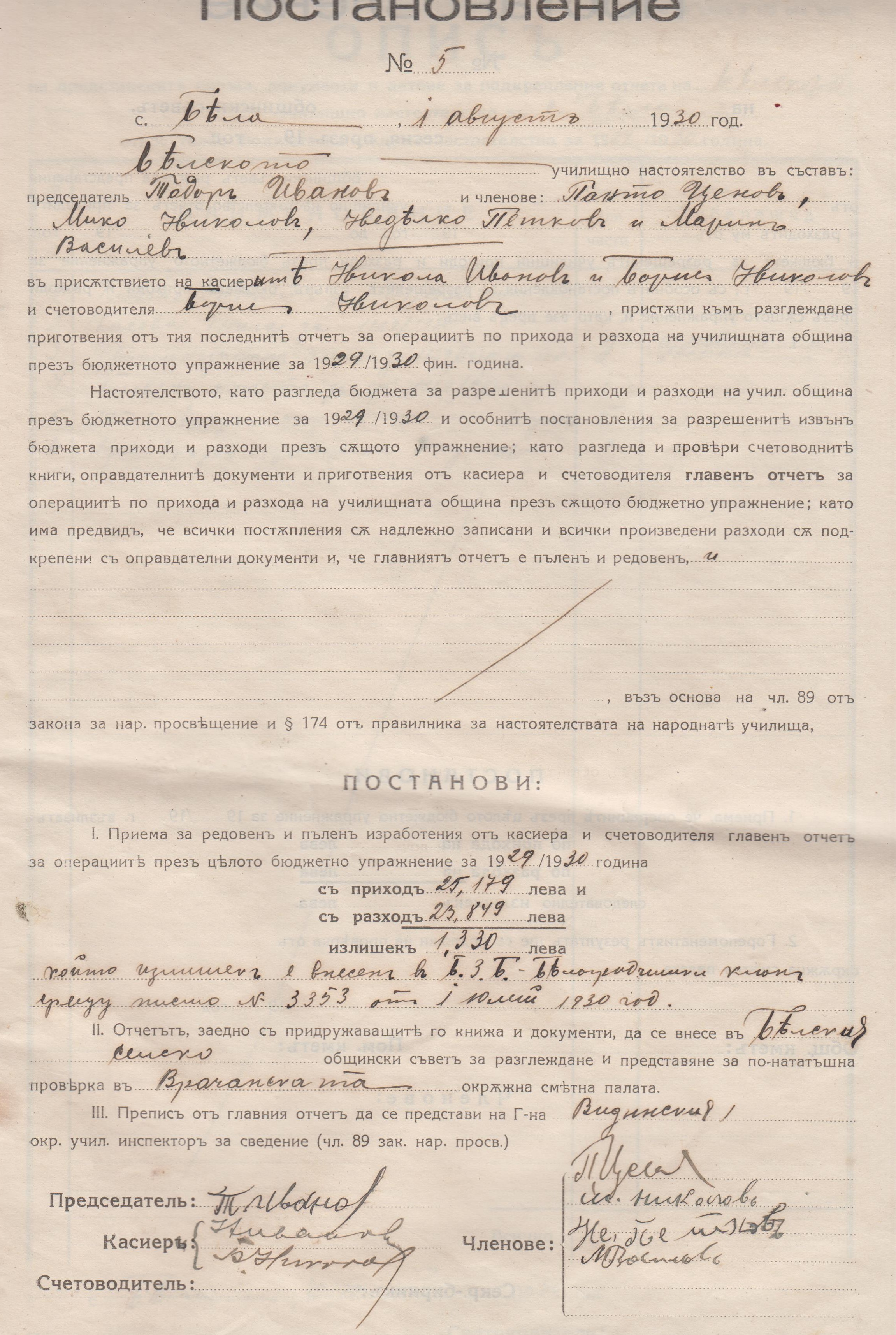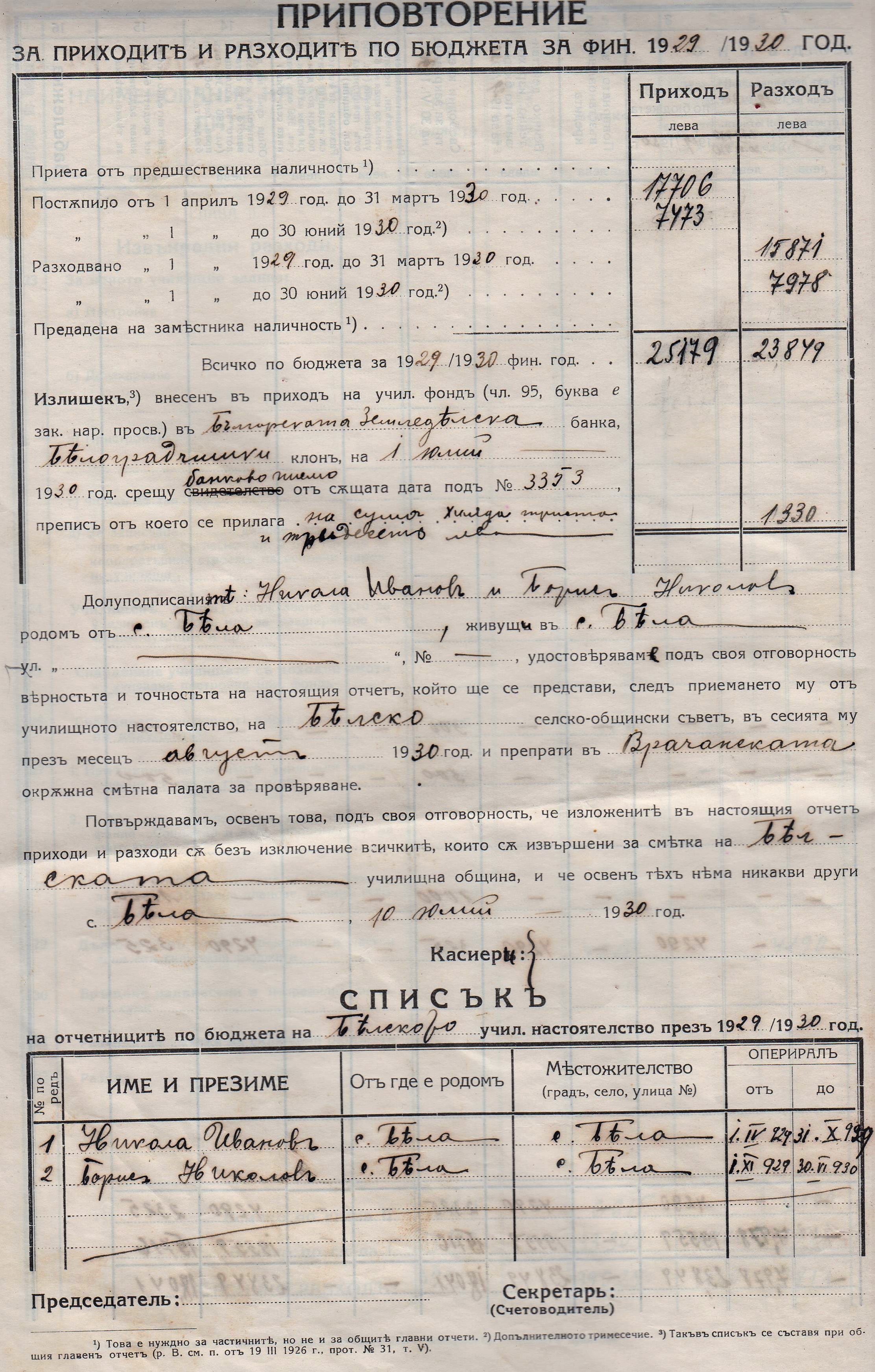 Никола Иванов и Борис Николов са отчетници по бюджета на училищното настоятелство за 1929 / 30 година.