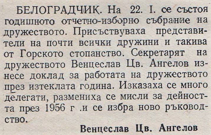 “ Белоградчик – На 22.01.1958 г. се състоя отчетно – изборно събрание на дружеството. Присъствуваха представители на почти всички дружинки и такива от горското стопанство. Секретарят на дружеството Венцеслав Цв. Ангелов изнесе доклад за работата на дружеството през изтеклата година. Изказаха се много делегати, размениха се мисли за дейността през 1956 г. и се избра ново ръководство.“