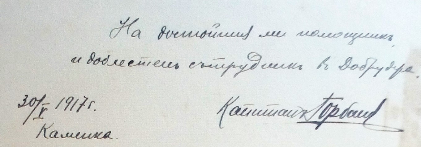 “ На достойния ми помощник и доблестен сътрудник в Добруджа. 30.05.1917 г. Село Каменка. подписана – Капитан ……….“