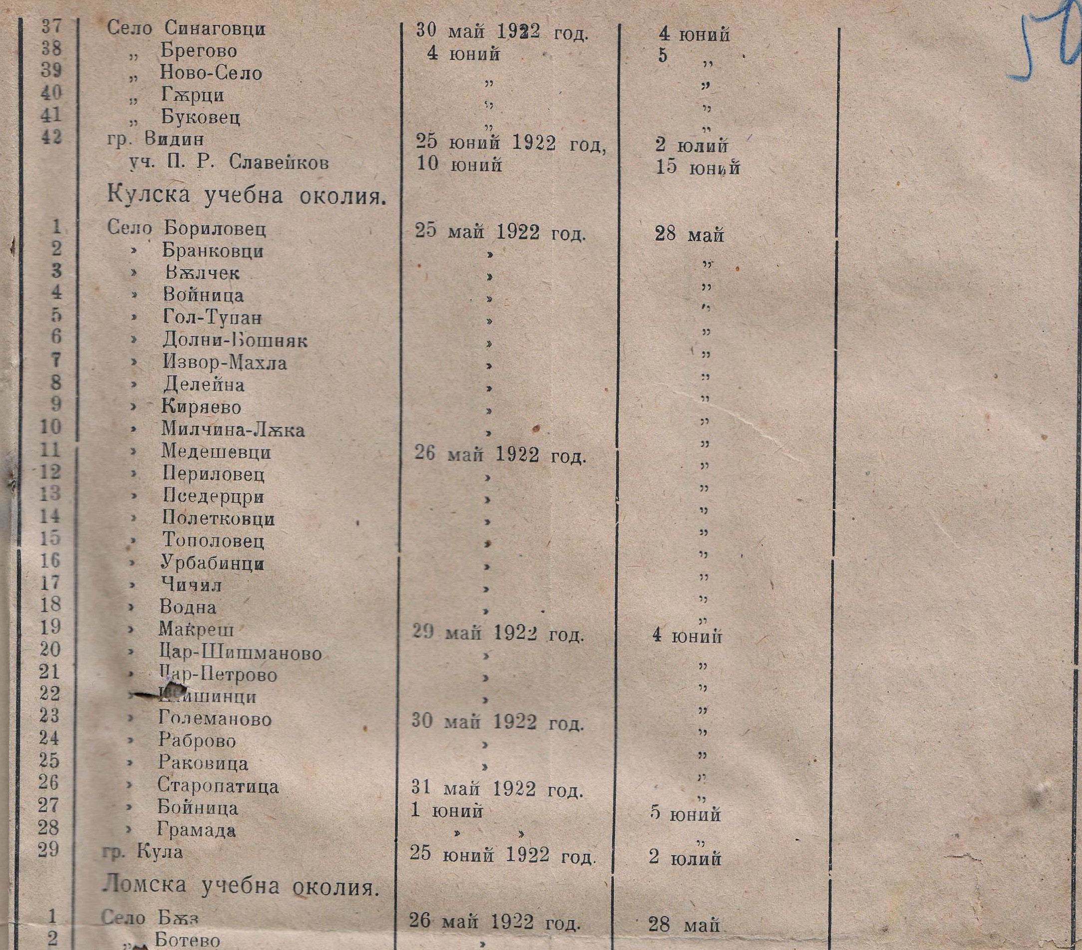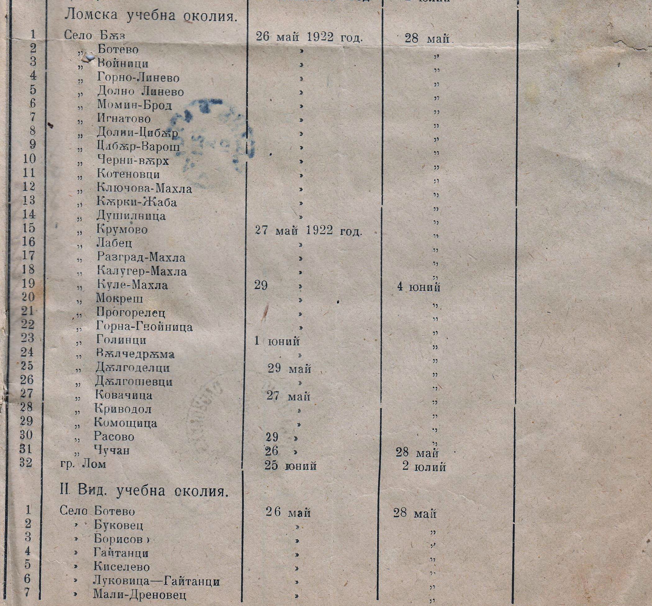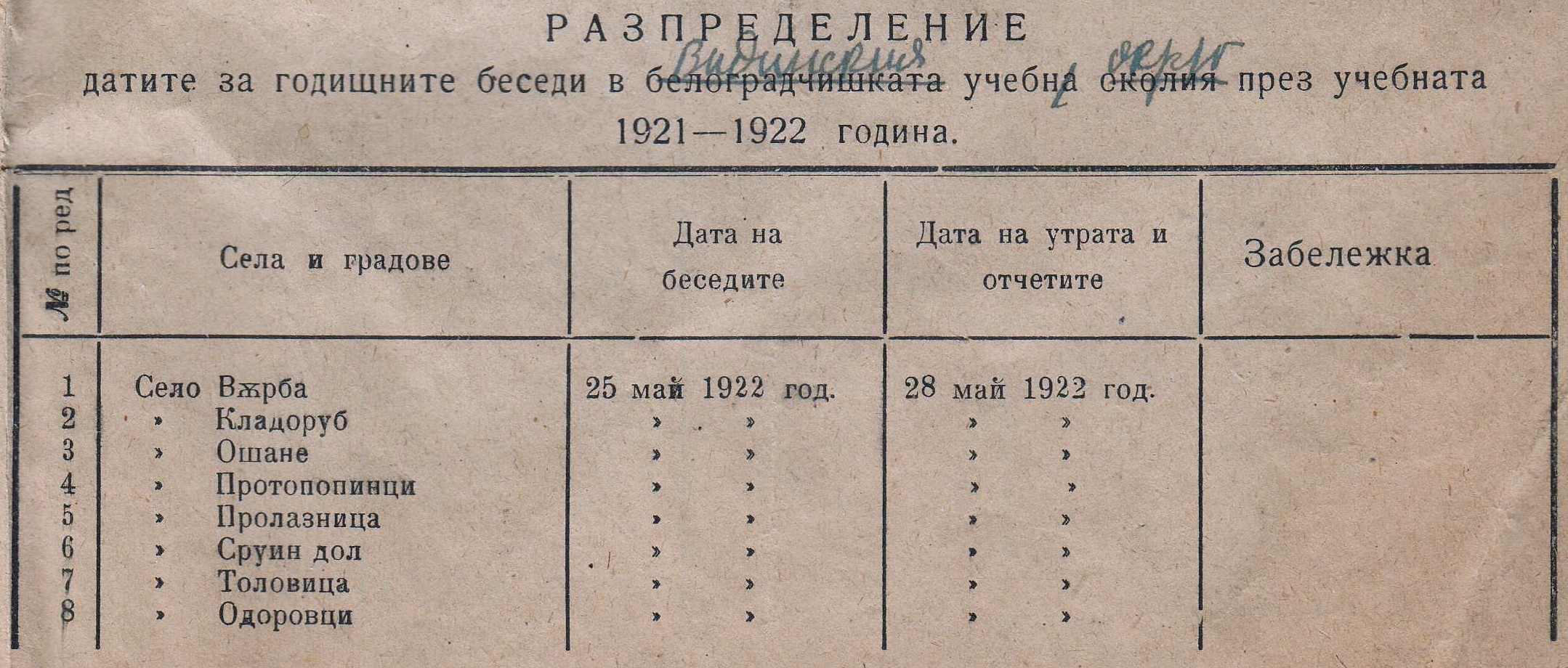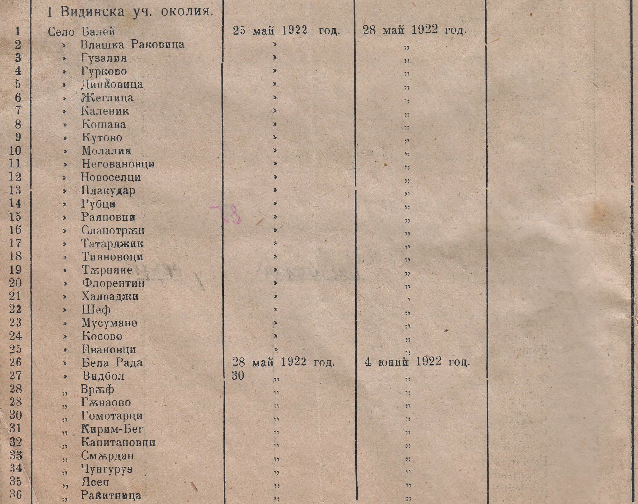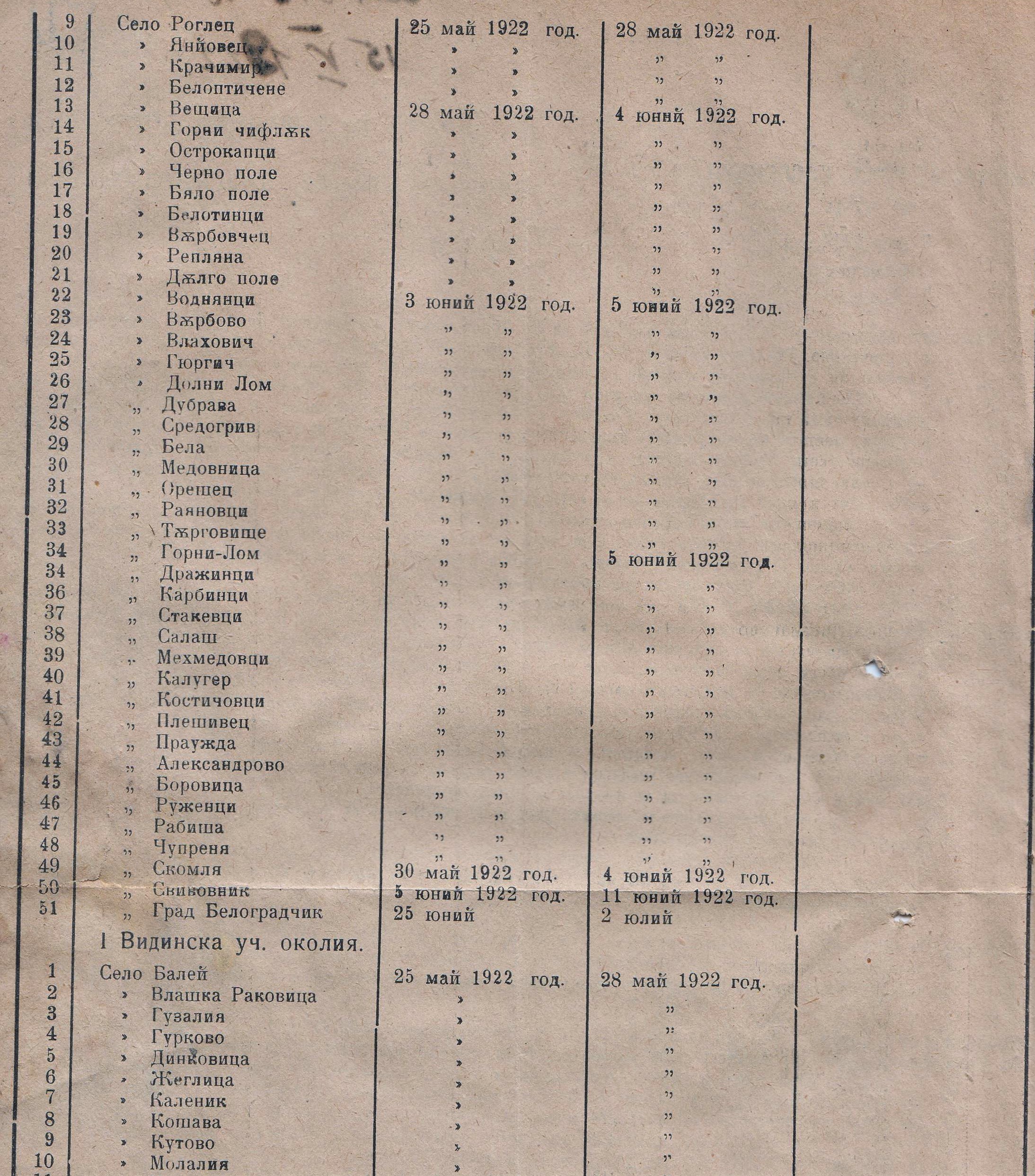 Датите за Белоградчишката учебна околия започва със с. Върба под N1 и завършва с гр. Белоградчик под N 51. Село Бела е под N 29. / 3 Юни 1922 г. -до 5 Юни 1922 г./