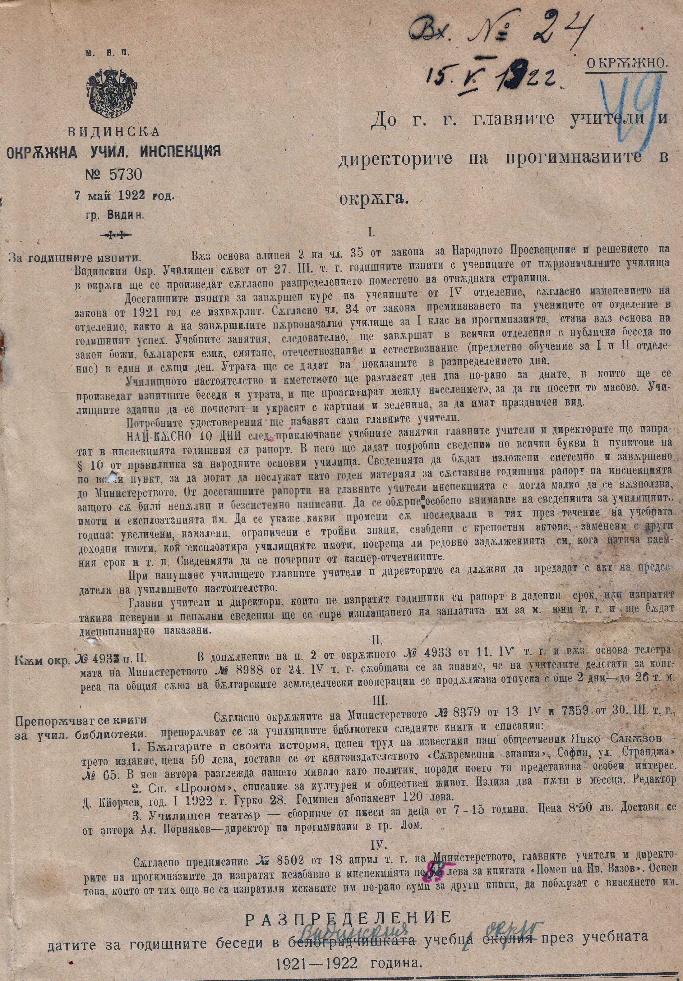 Ще ви представя един документ от „Видинската Окръжна Училищна Инспекция “ N 5730 / 7 Май 1922 г. – подписан от: