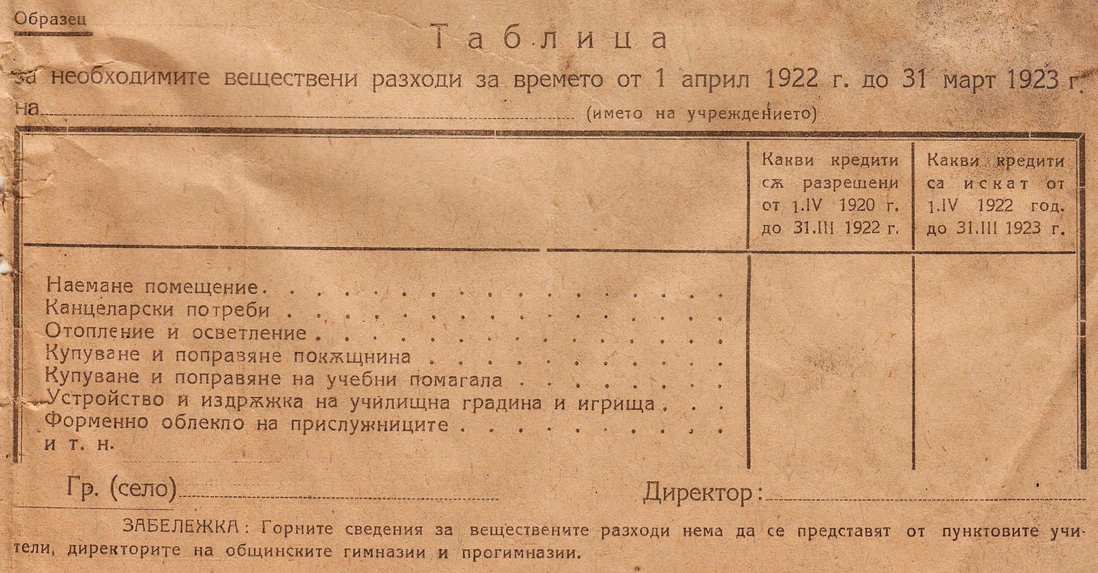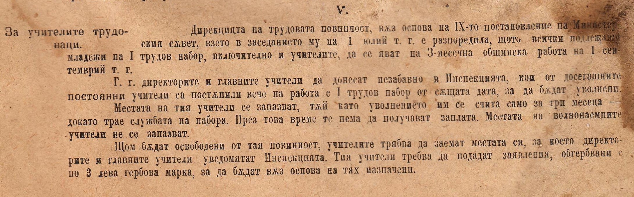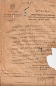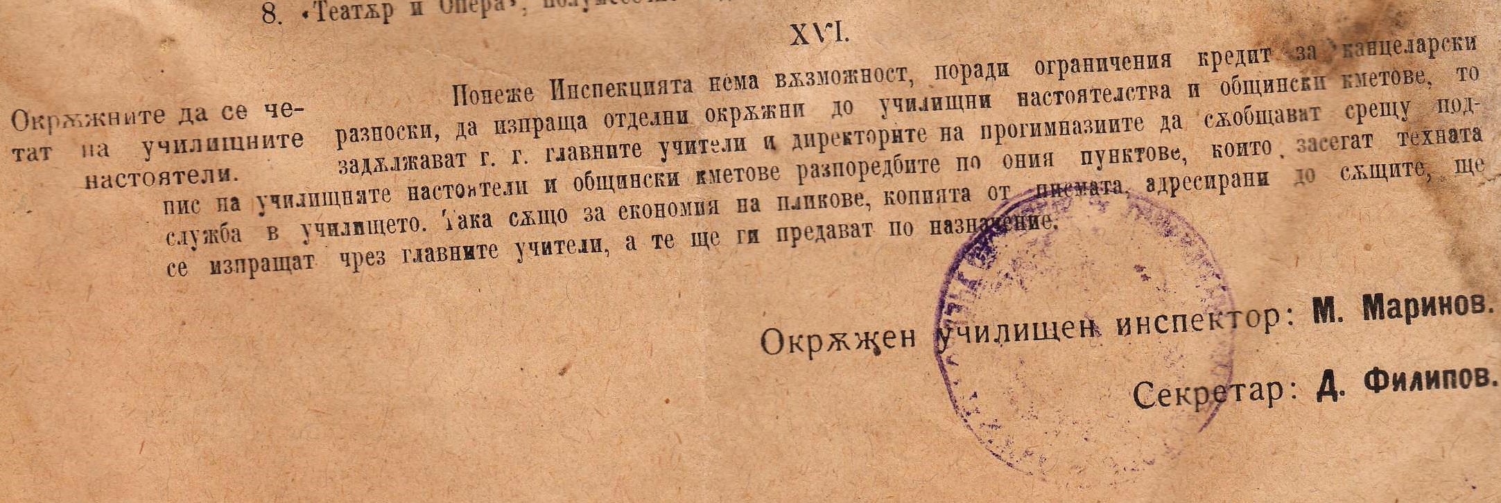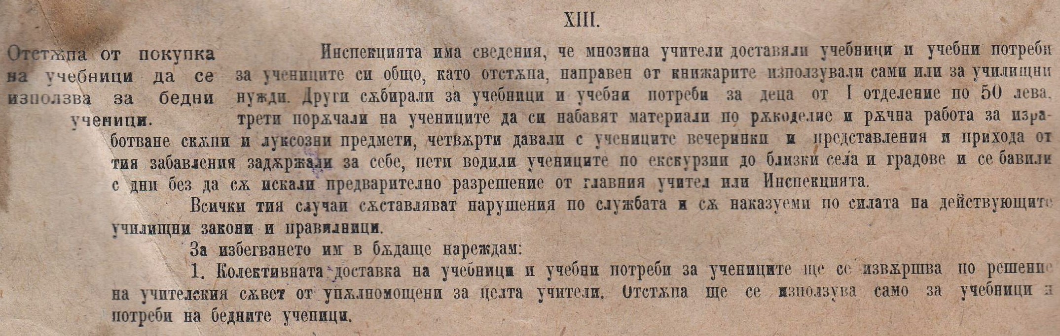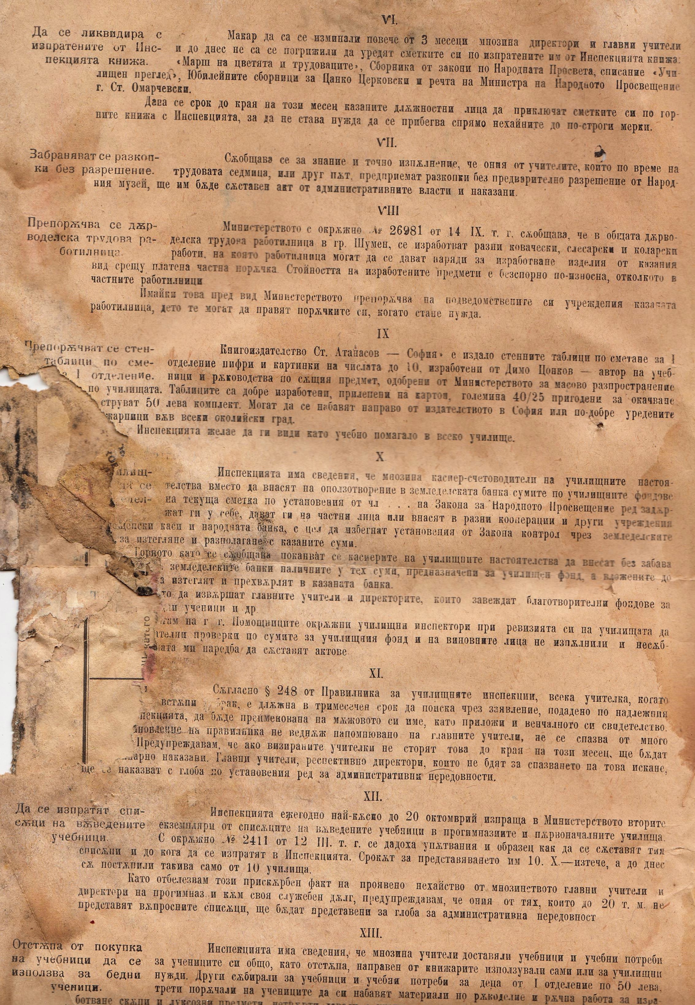 ..“ Да се ликвидира с изпратените от инспекциите книжа, Забраняват се разкопки без разрешение, Препоръчва се дърводелска трудова работилница, Препоръчват се стенни таблици по сметане, Неоползотворените средства да се внасят в Земеделската банка, Да се изпратят списъци на въведените учебници, Отстъпа от покупка на учебници да се използва за бедни ученици…“