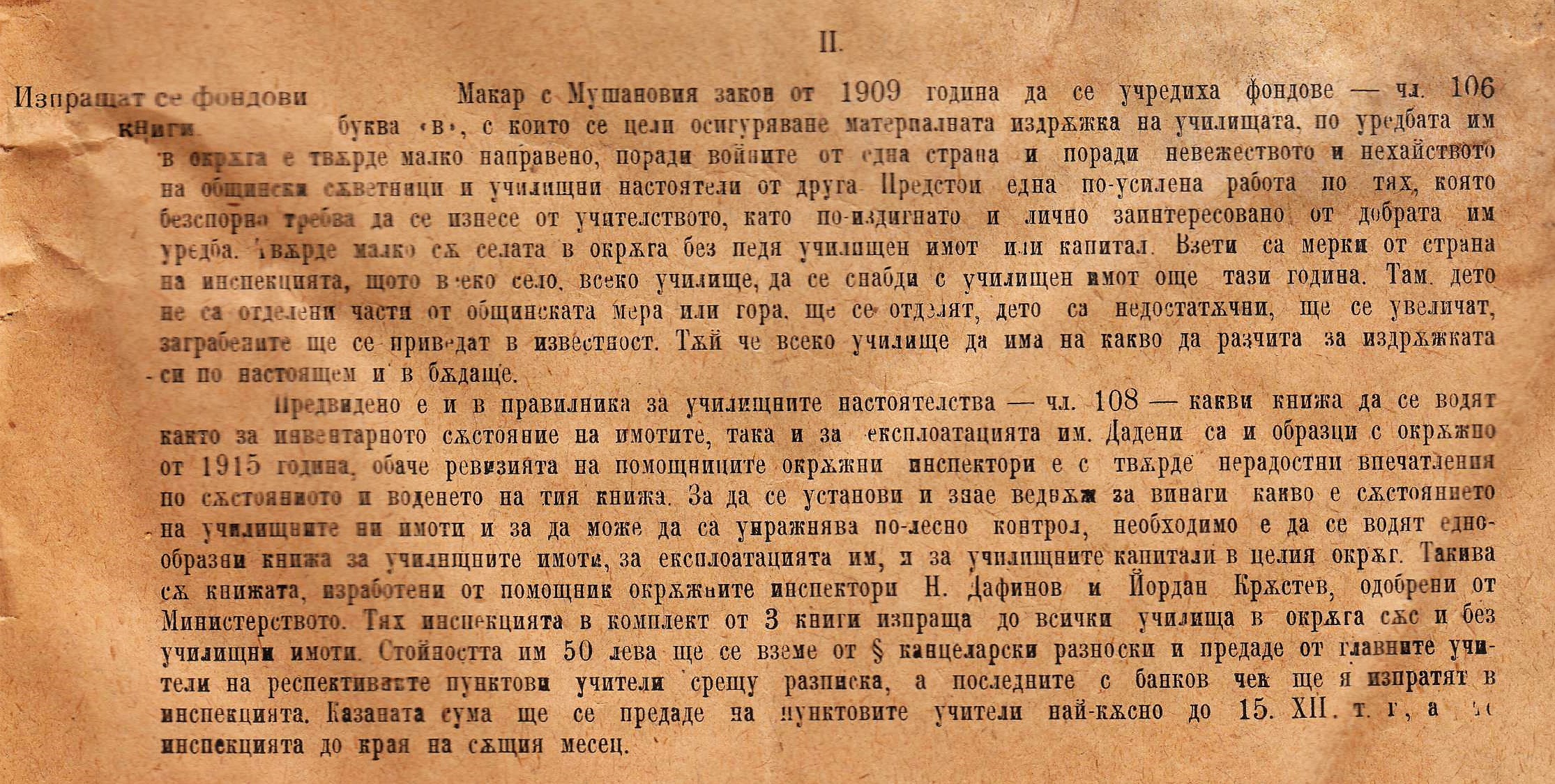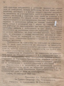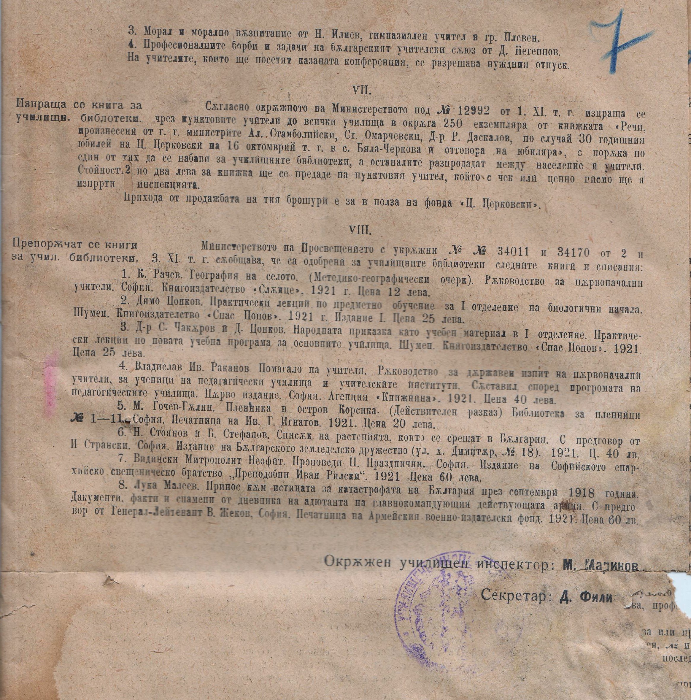 ..Изпращат се книги за училищната библиотека: речи на министрите – Ал. Стамболийски, Ст.Омарчевски, Д-р Р. Даскалов – по случай 30 годишния юбилей на Ц.Церковски, Препоръчват се книги за училищната библиотека: „География на селото“ К.Рачев, „Практически лекции по предметно обучение за 1 во отделение на биологични начала“ Димо Цонков, „Народната приказка като учебен материал за 1 во отделение“ Д-р С.Чакъров и Димо Цонков, “ Помагало на учителя“ Владислав Ив.Раков, „Пленника в остров Корсика“. /Действителен разказ / Библиотека за пленници N 1 до 11. М.Гочев – Гълин, “ Списък на растенията които се намират в България“ с предговор от И.Странски – Н.Стоянов и В. Стефанов, „Проповеди празнични 2″ Видински митрополит Неофит, “ Принос към истината за катастрофата на България през Септември 1918 г. Документи, факти и спомени от дневника на адютанта на главнокомандующия действующата армия. Предговор от генерал лейтенант В.Жеков. – Лука Малеев.