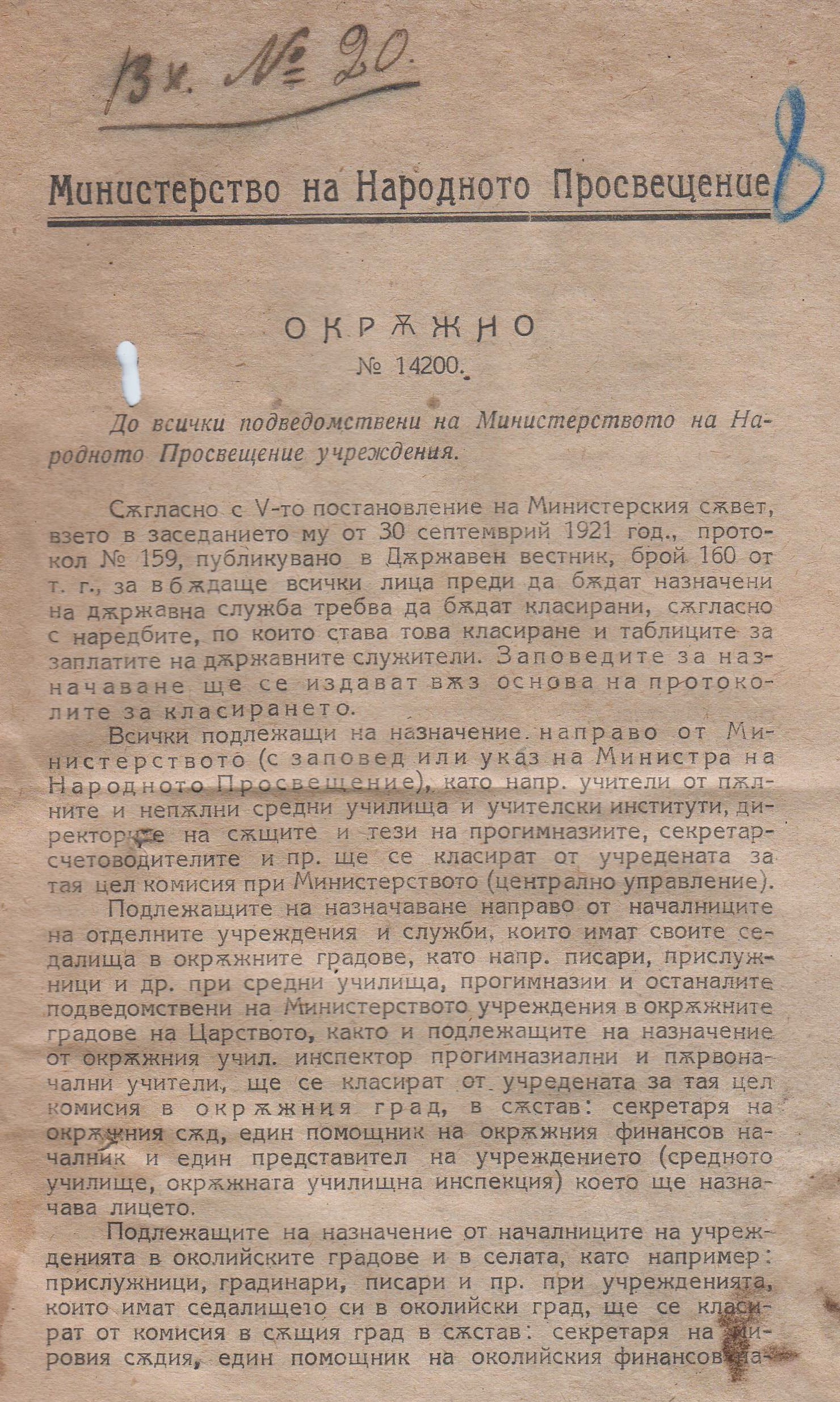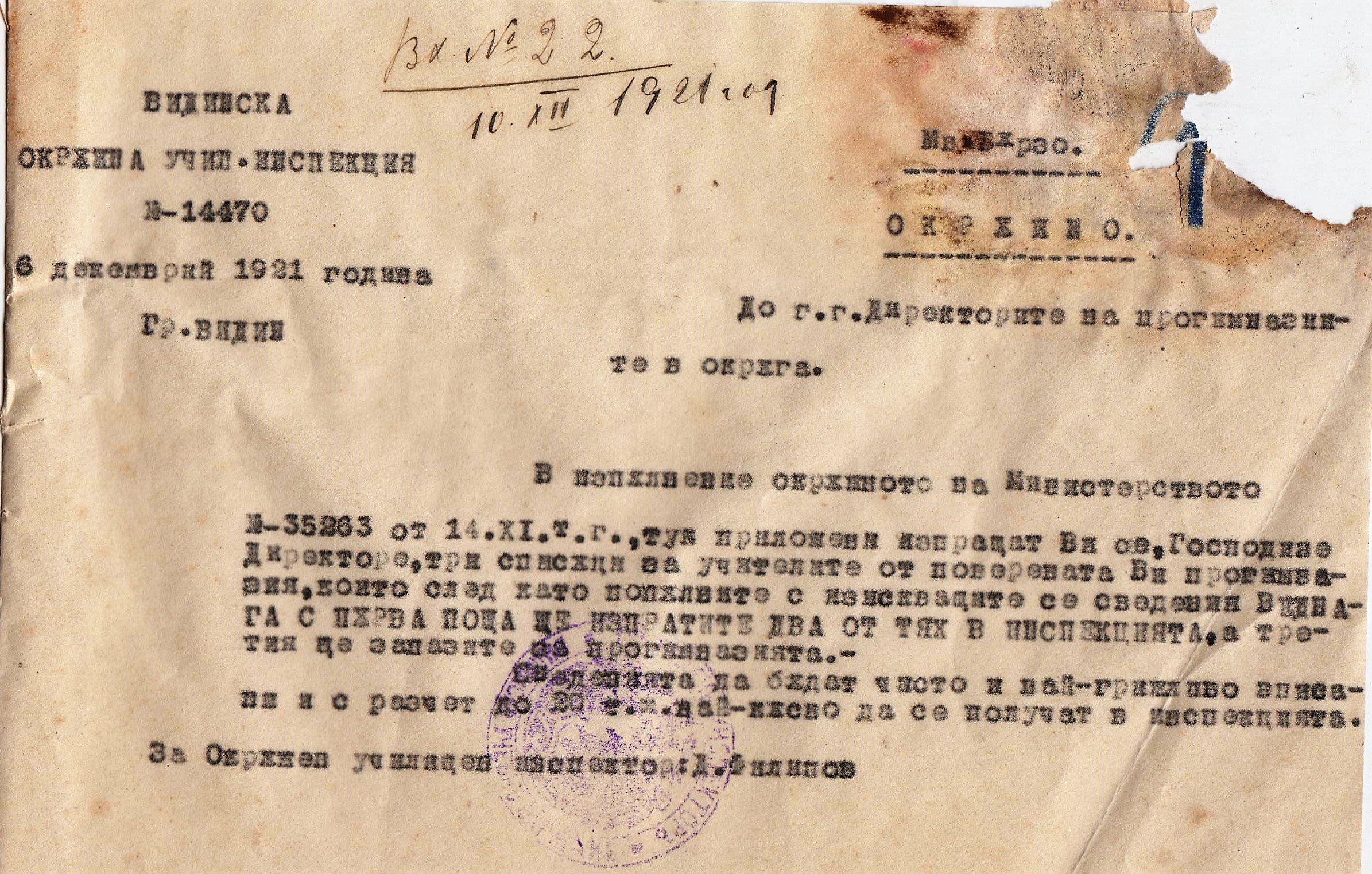 Видинска Окръжна училищна инспекция N 14470 / 6.12.1921 г.