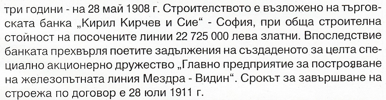 След няколко проучвания 1895, 1900 и 1904 г. през 1905 година е приет вариант. След три години търгът е проведен и строежа е възложен на банката „Кирил Кирчев и Сие“ – 28 Май 1908 г. Сумата е 22 725 000 златни лева. Създава се специално акционерно дружество „Главно предприятие за построяване на железопътната линия Мездра – Видин“. Срокът за завършване на строежа по договор е 28 Юли 1911 г.