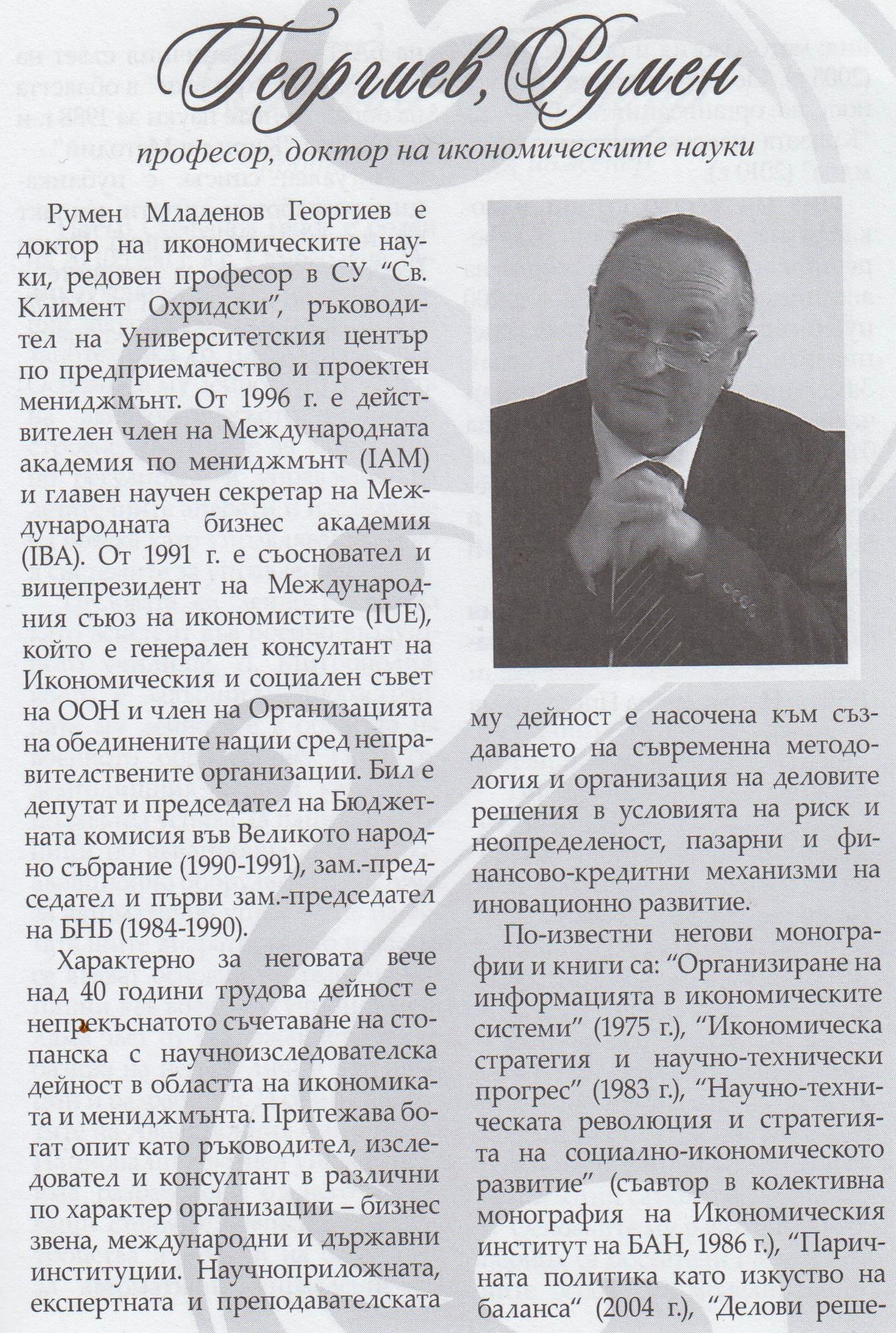 На страница 55- та е представен професор, доктор на икономическите науки Румен Младенов Георгиев. Не се посочва , кога и къде е роден. Завършва с пълно отличие гимназията в гр.Видин.