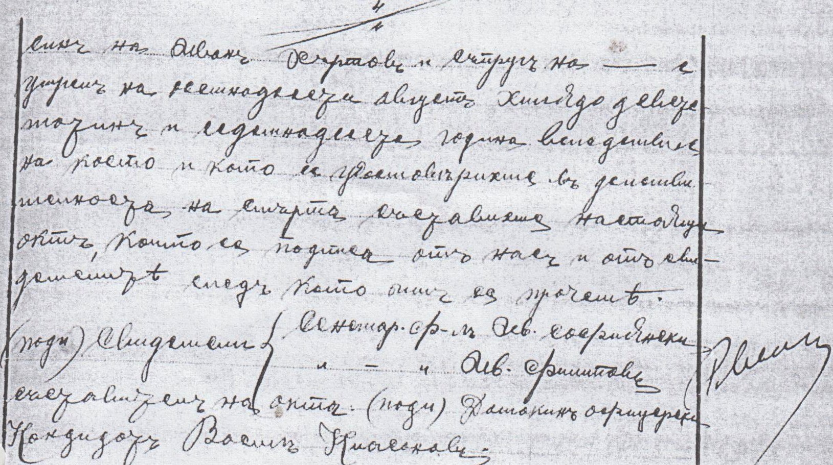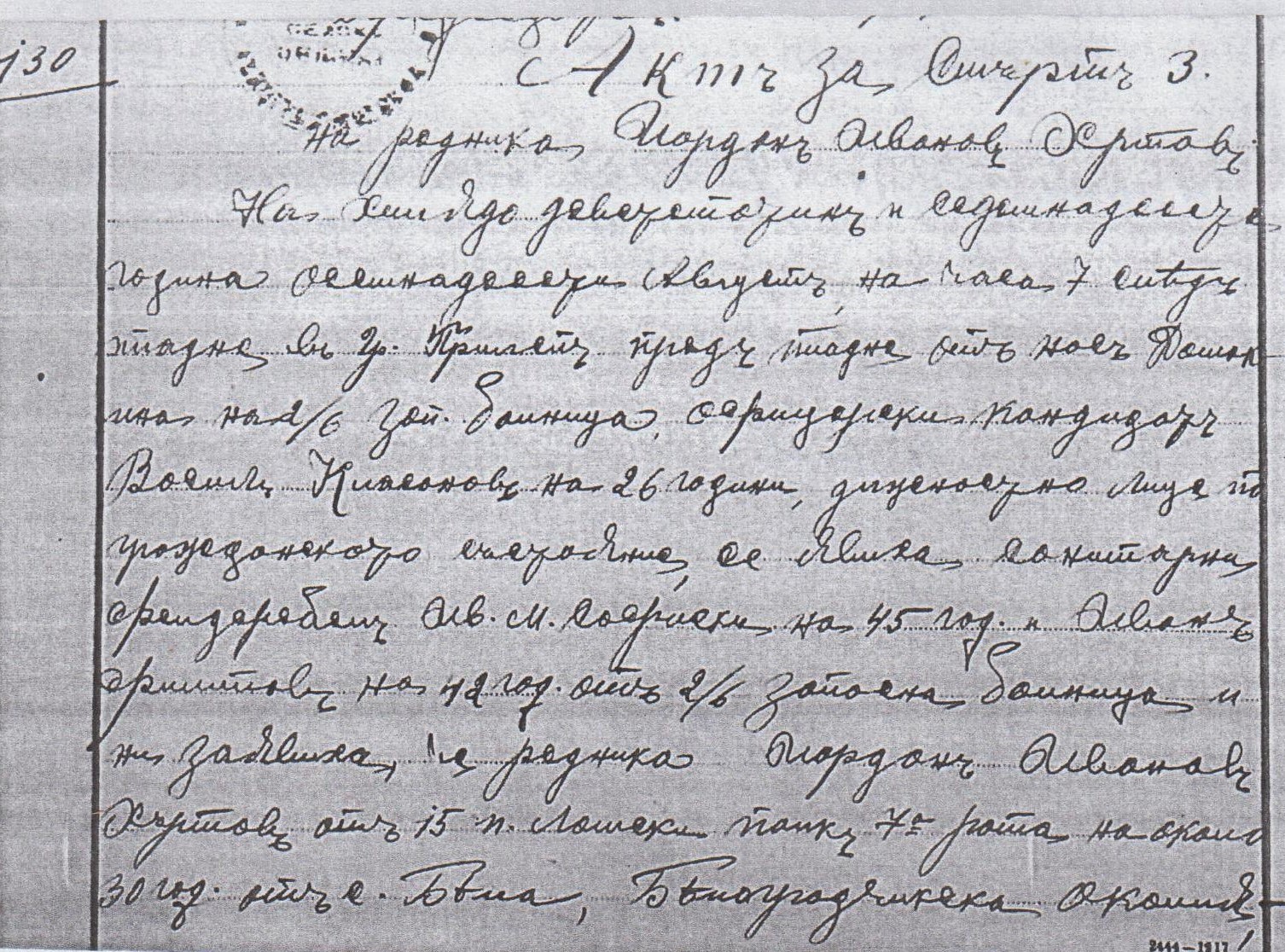 На хиляда деветстотин и седемнадесета година осемнадесети Август на часа 7 след пладне в гр.Прилеп преди пладне от нас ……на 2/6 зап.болница офицерски кандидат Васил Киасанов на 26 години, длъжностно лице по гражданското състояние, се явиха санитарния фелдфебел Ив.М.Софийски на 45 год. И Иван Филипов на 42 год. От 2/6 запасна болница и ни заявиха, че редник Йордан Иванов Хъртарски от 15 п.Ломски полк, 7 ма рота на около 30 години от с.Бела, Белоградчишка околия, син на Иван Хъртарски и съпруг на ……..е умрял на осемнадесети Август хиляда деветстотин и седемнадесета година в следствие на което и като се удостоверихме в действителността на смъртта съставихме настоящия акт, който се подписа от нас и от свидетелите – след като се прочете.