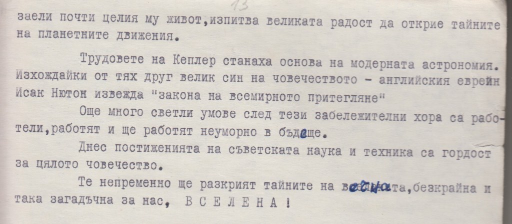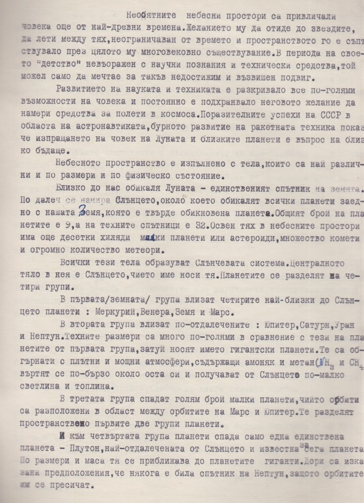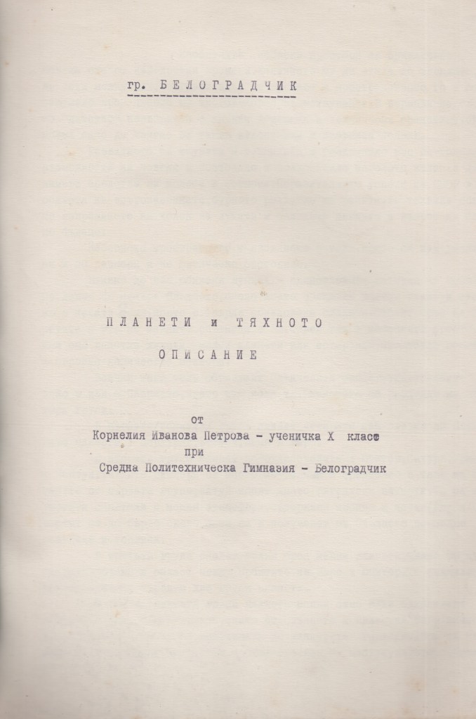 Завършилата с пълно отличие СРЕДНА – ПОЛИТЕХНИЧЕСКА ГИМНАЗИЯ гр.Белоградчик випуск 1968г. в 10 ти клас пише : „ПЛАНЕТИ И ТЯХНОТО ОПИСАНИЕ“. Преди време публикувах наградата, която е получили за участието си в кръжока по физика. Сега представям нейната работа на тема „ПЛАНЕТИТЕ…“