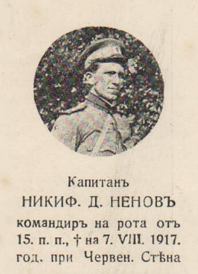 Капитан Никифор Ненов Данов /Дановски/ е командир на 7 ма рота от 15 пехотен Ломски полк. Загива на 07.08.1917г. на „Червената стена“. Погребан е в двора на църквата в гр.Прилеп. В седмичното списание „ОТЕЧЕСТВО“ от 30 Септември 1917г. кн.39 в раздела – ПАДНАЛИ ЗА РОДИНАТА се събщава за неговата гибел.