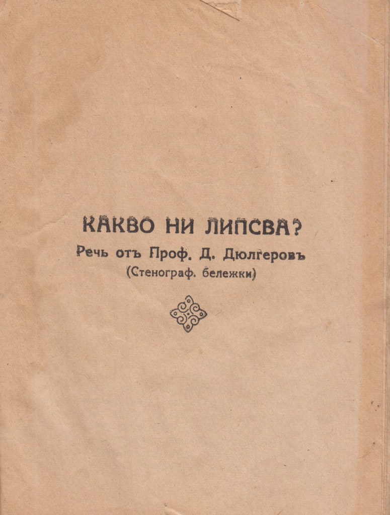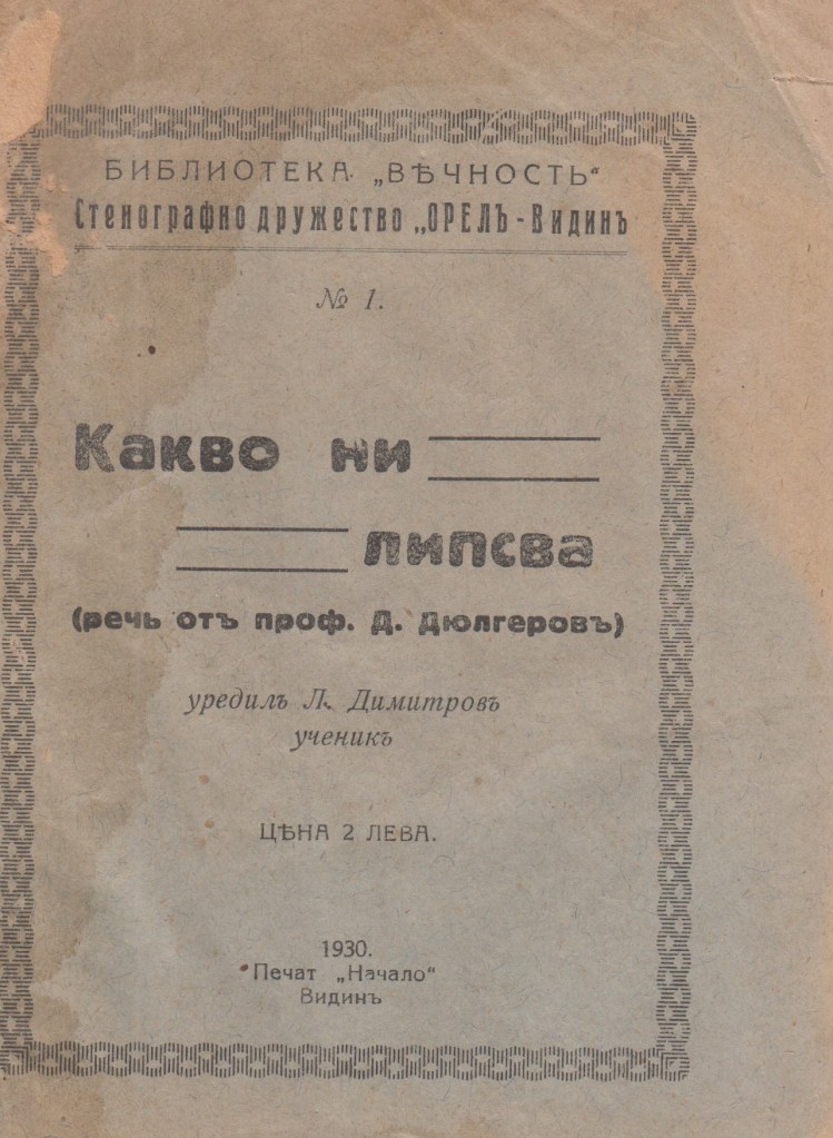 2. Какво ни липсва – реч пред народното събрание от проф. Д.Дюлгеров – 1930 год., издание гр.Видин от ученика Л. Димитров – Библиотека „ВЕЧНОСТ“ – Стенографно дружество „ОРЕЛ“ – ВИДИН. Печат „НАЧАЛО“ Видин.
