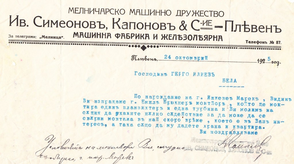 През 1925 година в село Бела усилено се строи новата сграда на мелницата собственост на Герго Илиев Пешев. Повечето от машините са доставени от Мелничарско машинно дружество „Ив.Симеонов, Капонов и С-ие“ гр.Плевен.