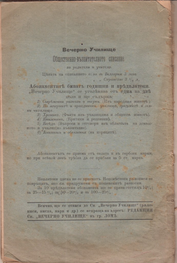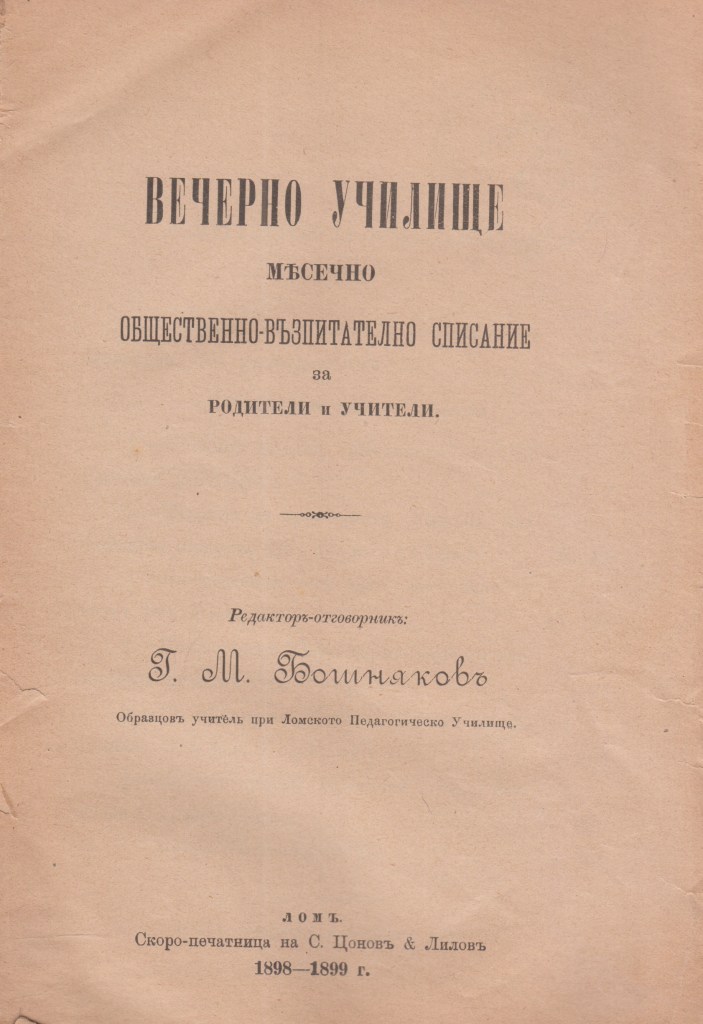 СПИСАНИЕ – Вечерно училище – редактор Г.М.Бошняков 1898/99 година.
