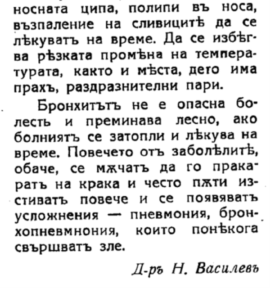 Д-р Никола Василев завършва медицина в гр. Лозана, Швейцария. Веднага след завършването е мобилизиран и участва в Първата световна война, като дружинен лекар в 42 пехотен полк. Награден е с кръст за храброст. По собствено желание работи във Френска болница лекувайки българските войници оставени в заложничество. След войната работи във военната болница в гр.Враца, като Околийски лекар в гр. Белоградчик и като ординатор в Александровска болница. Към 1931 година той е един от известните лекари в гр.София. Издава много книги на медицинска тематика. Във списание Духовна нива бр.1 от 1943 година, публикува статия – БРОНХИТ