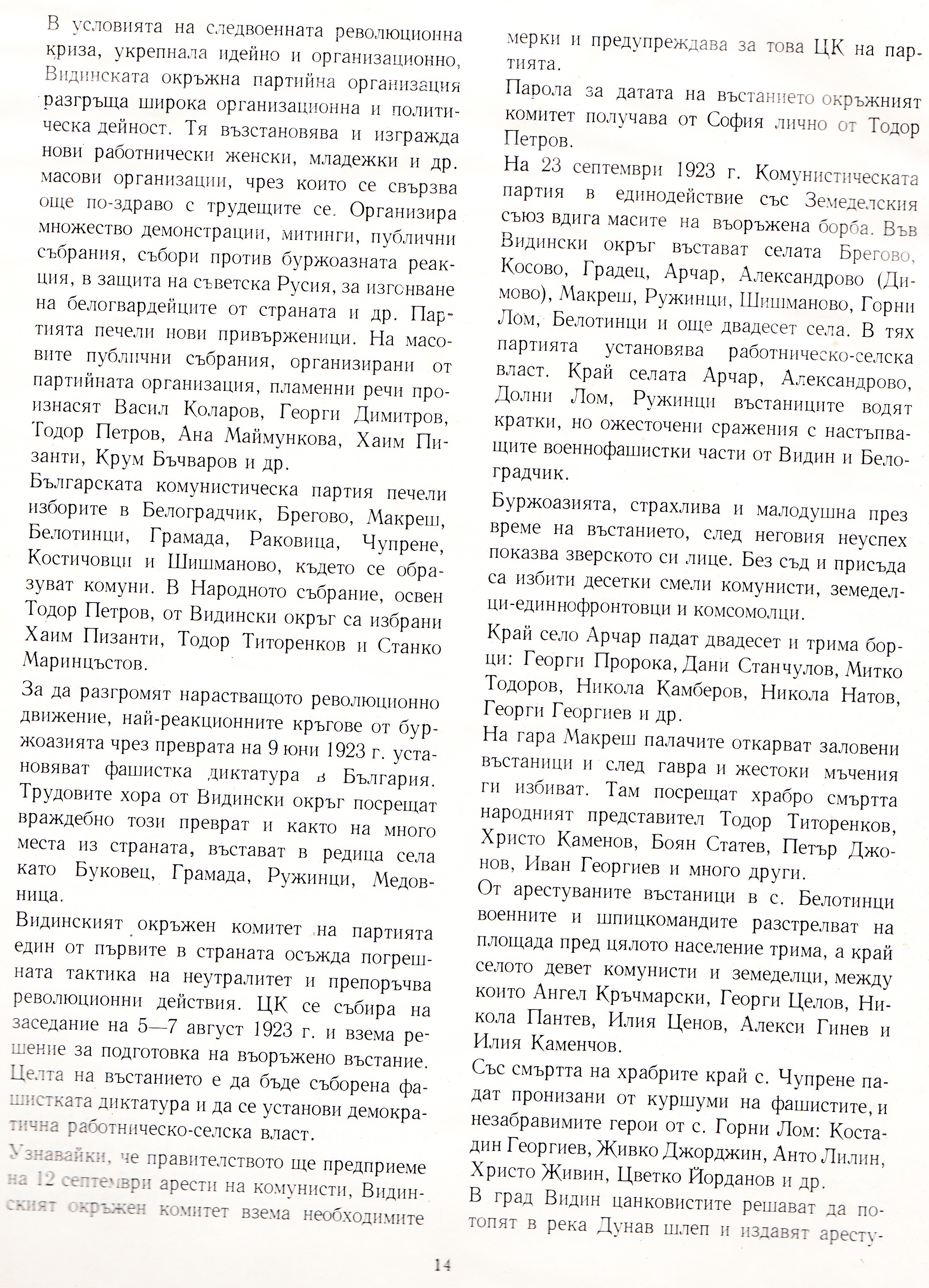 23-26 Септември 1923 г. – Сражения на въстаниците с правителствените фашистки войски при с.Брегово, Косово, Градец, Арчар, Димово, Костичовци, гара Воднянци, Ружинци и в местността „Суха падина“ край Горни Лом….“