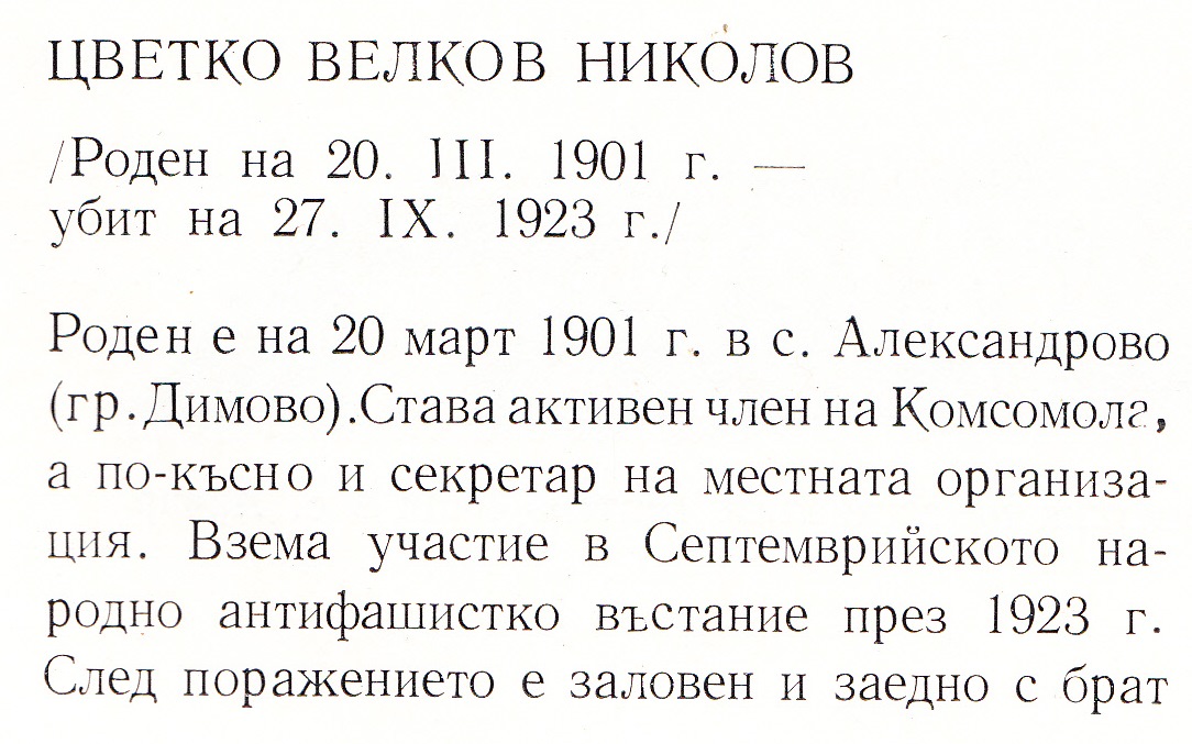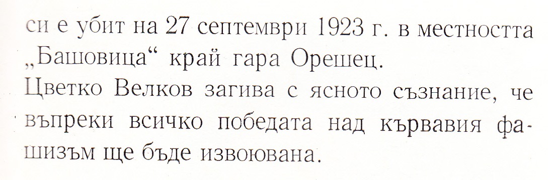 27 Септември 1923 г. – На Макрешкия кантон убити по най-зверски начин: Христо Каменов – гр.Видин, Тодор Титуренков – Тулчанско, Боян Статев – Ружинци, Петър Джонов – Ружинци и Цоло Иванов – с.Бела….“